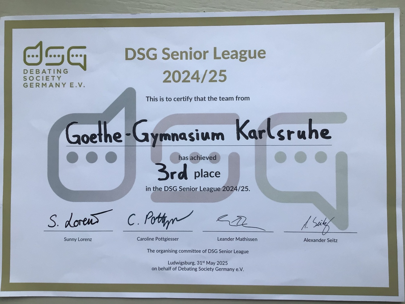 - 1. Platz im RB-Finale. Mit fünf Siegen in fünf Schulvergleichen sicherte sich das Goethe-Team den ersten Platz im RB-Finale Karlsruhe und qualifizierte sich somit für das Landesfinale Baden-Württemberg. Dort hat man nun die Möglichkeit, um den Einzug in das Bundesfinale in Berlin zu spielen. Insgesamt acht Teams von acht Schulen aus dem Regierungsbezirk Karlsruhe traten am Donnerstag, den 05.06.25, im RB-Finale in Rüppurr an.