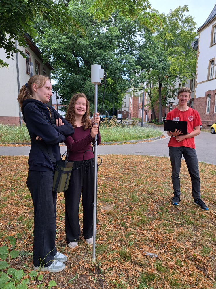 auf dem Goethe-Gymnasium. Auf unserem Dach haben wir eine eigene Wetterstation! Sie wurde Ende 2024 installiert und ging Anfang 2025 in Betrieb. Seitdem misst und speichert sie zuverlässig Messwerte zu Temperatur, Luftdruck, Niederschlag und Feuchtigkeit. Die Wetterdaten werden nicht nur in der Wetter-AG sondern auch im Geographie-, Physik- und Mathematik-Unterricht verwendet.