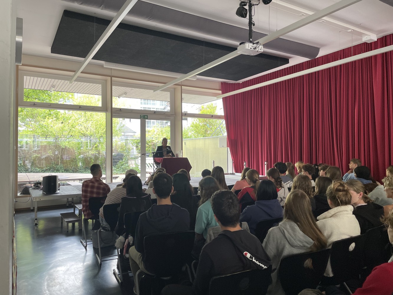 von Jennifer Teege aus ihrem Buch „Amon. Mein Großvater hätte mich erschossen“. Am 09. Juli 2025 besuchte Jennifer Teege das Goethe-Gymnasium Karlsruhe und hielt für die Schüler*innen der Jahrgangsstufe 1, die sich im Geschichtsunterricht gerade intensiv mit der nationalsozialistischen Diktatur und dem Zweiten Weltkrieg auseinandergesetzt haben, eine Lesung aus ihrem Buch „Amon. Mein Großvater hätte mich erschossen“ (2013). In dem Buch und in der Lesung im Pavillon schildert Teege, wie sie im Alter von 38 Jahren durch einen Zufall herausfand, dass sie die Enkelin von Amon Göth, einem SS-Hauptsturmführer und Kommandanten des Konzentrationslagers Plaszów ist, der auch als „Schlächter von Plaszów“ gefürchtet war.