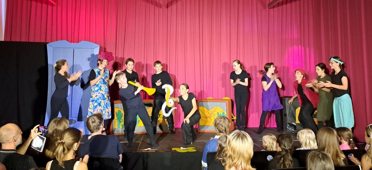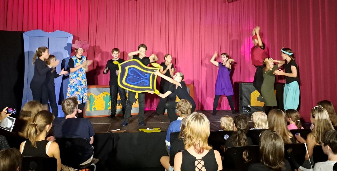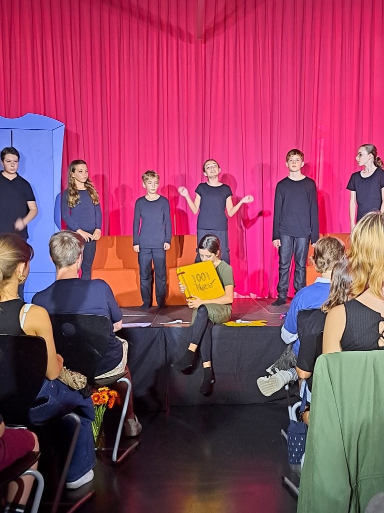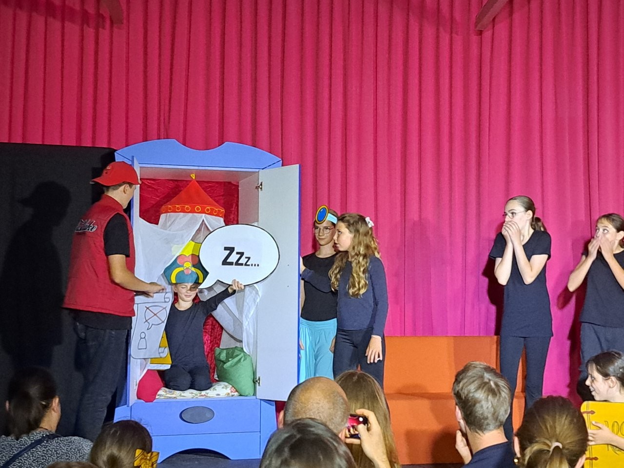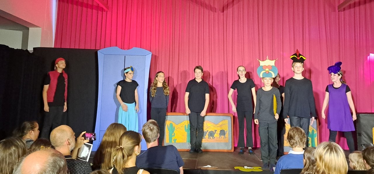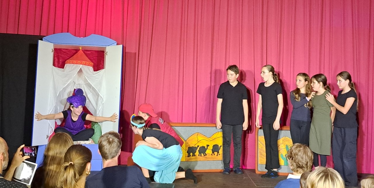 spielt Lippels Traum. Die Schüler*innen der Unterstufen-AG boten zwei grandiose Vorstellungen: Lippels Traum - nach dem Kinderbuch von Paul Maar. Die Geschichte spielt in einer Woche, die Lippel (eigentlich Philippa) ohne ihre Eltern aber mit Betreuerin verbringt, und gleichzeitig einen Traum im Morgenland erlebt. Dabei taucht sie in den Zauber des Orients ein, findet neue Freunde, durchquert die Wüste und meistert gefährliche Situationen.