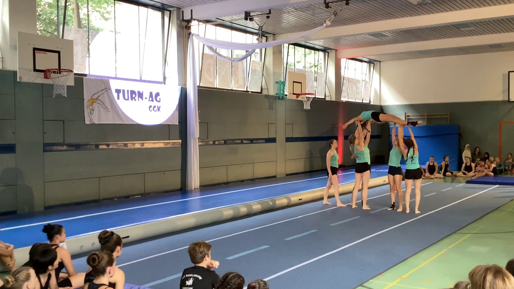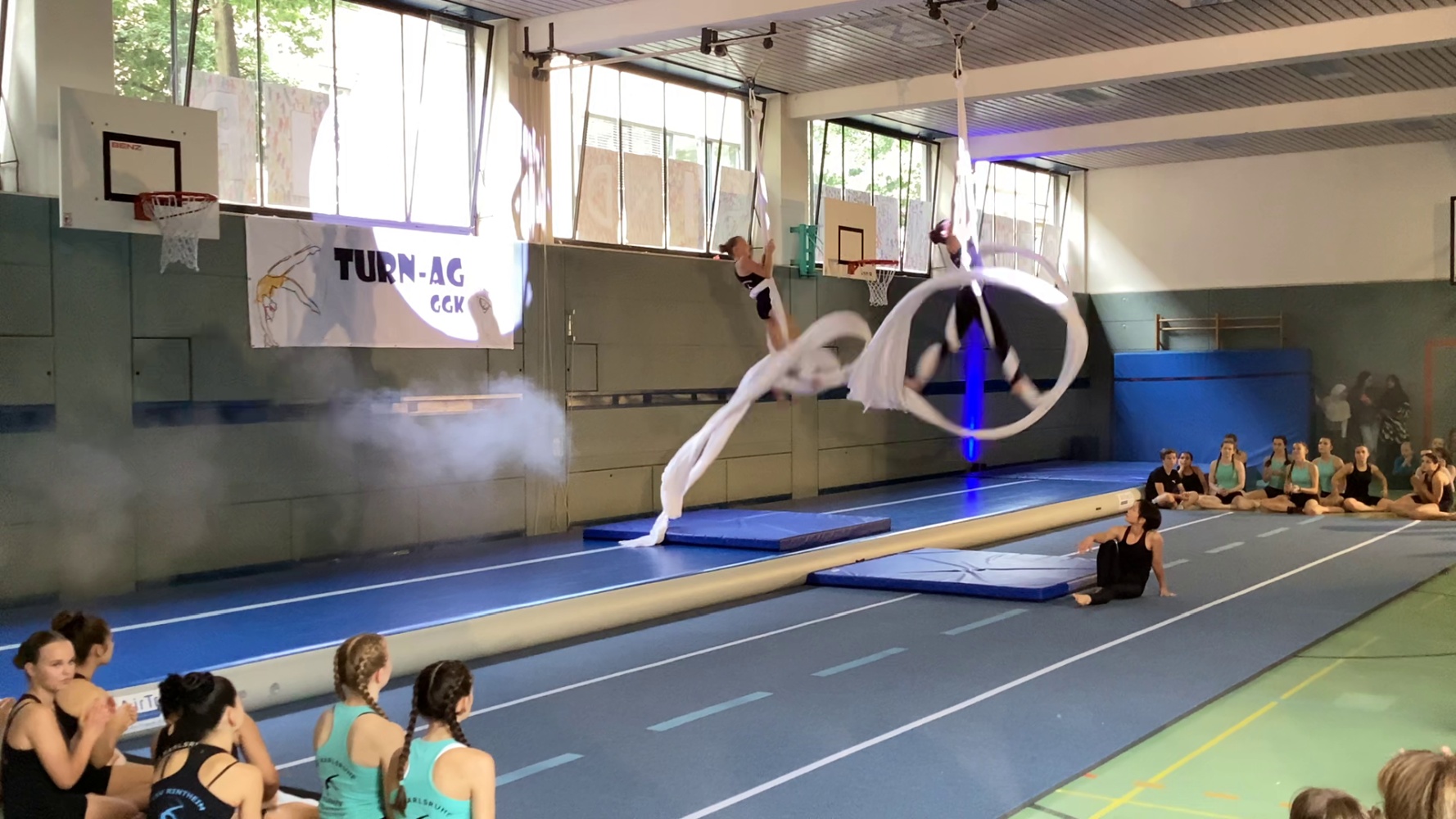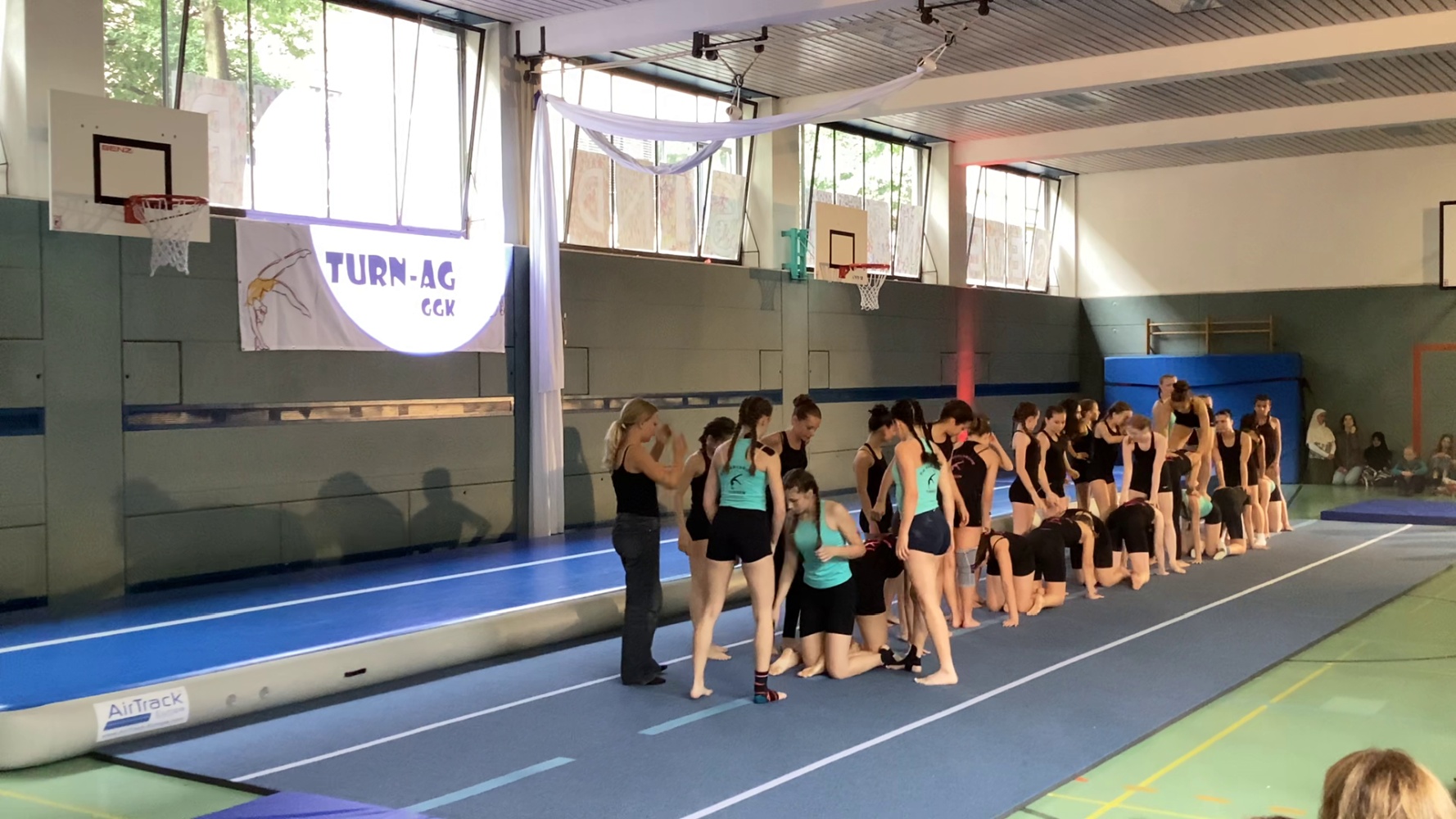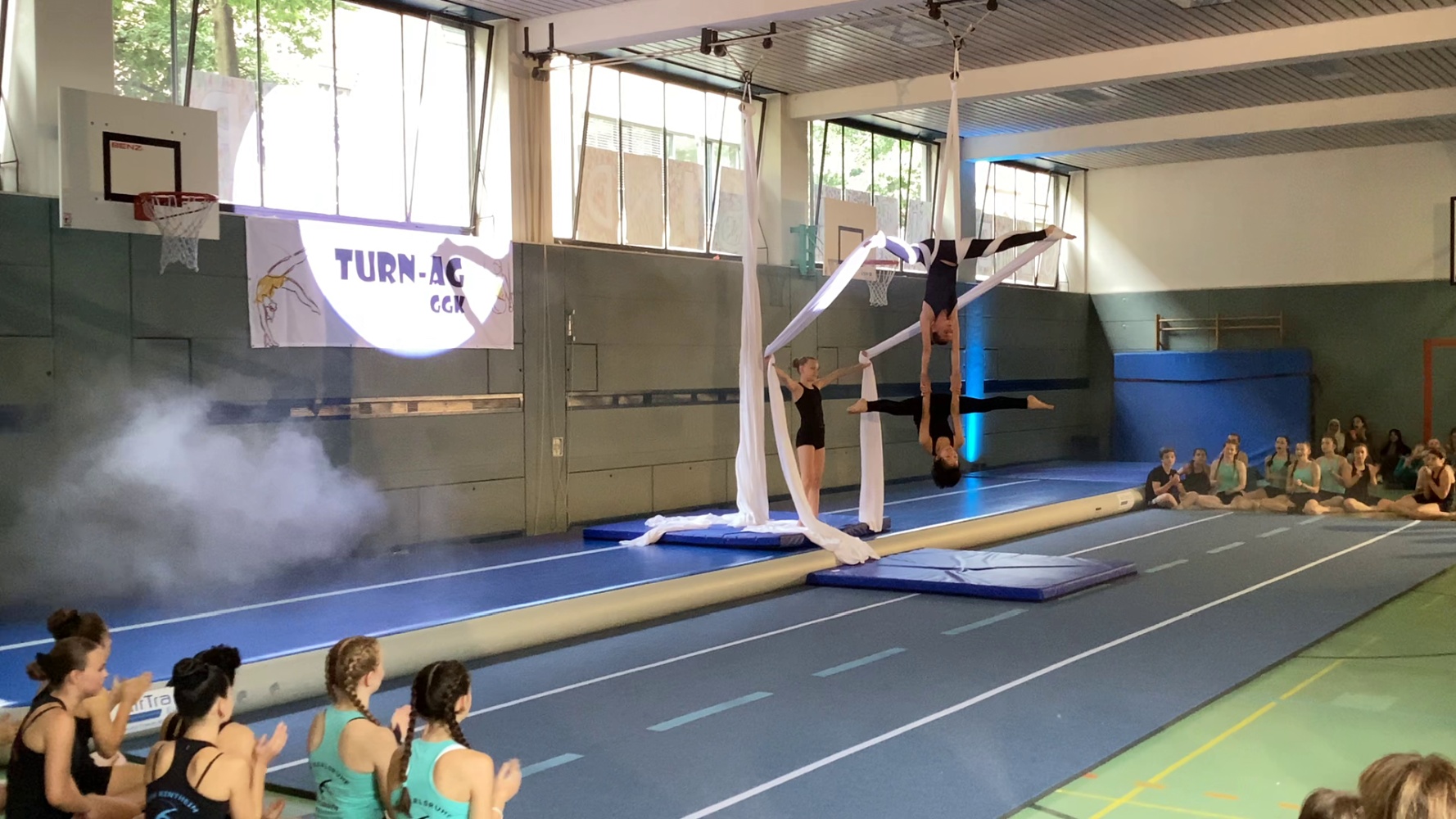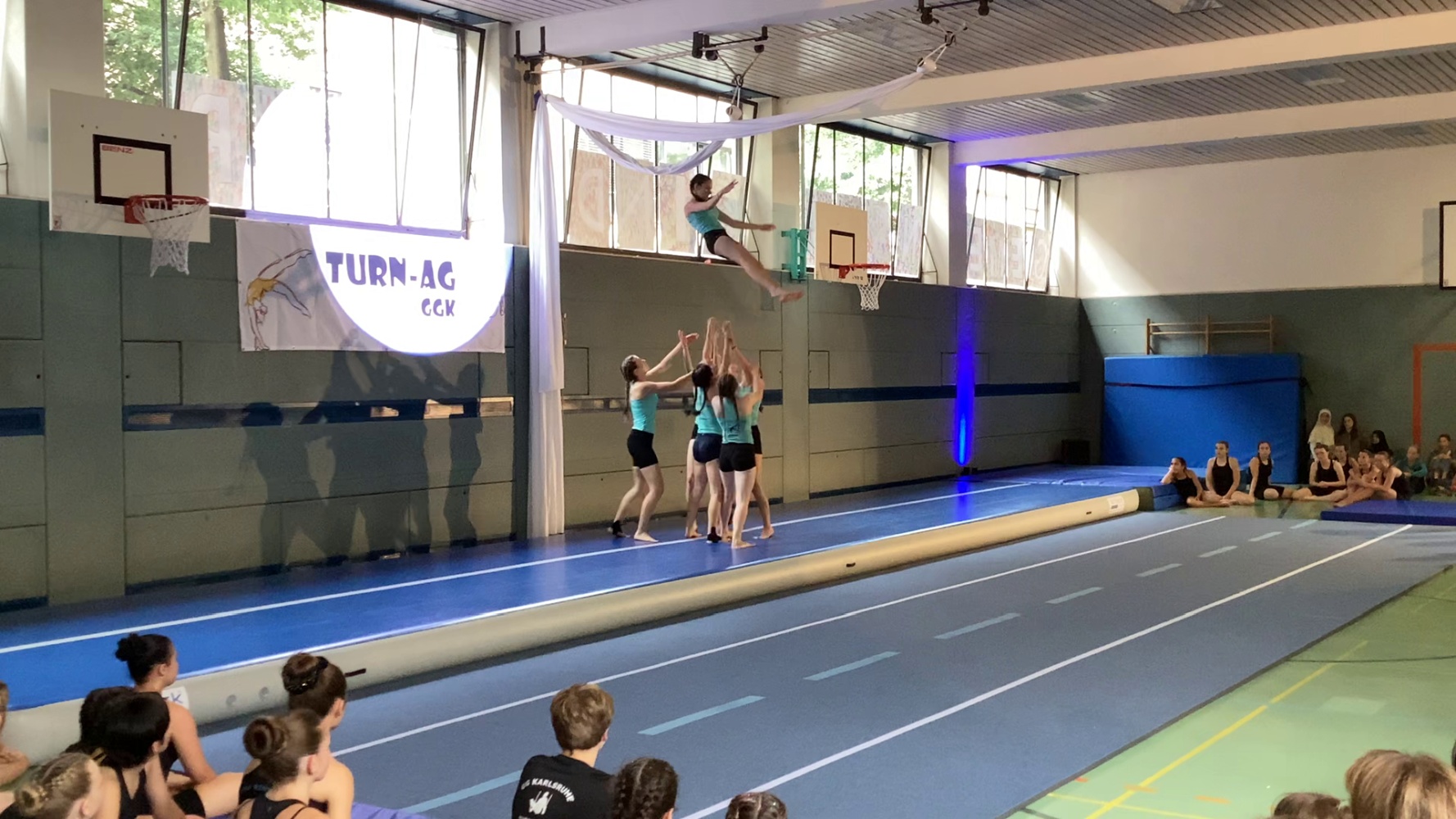 Mit einer unterhaltsamen und sehenswerten Show am Schulfest verabschiedete sich die → AG Gerätturnen/Akrobatik in die verdienten Sommerferien. 32 Turner und Turnerinnen aus 15 verschiedenen Klassen nahmen das Publikum zur Musik von ABBA mit auf eine Reise durch die vielseitige Welt des Turnens: Tänzerische, turnerische und anspruchsvolle akrobatische Elemente und Figuren wurden ergänzt durch eine wunderbare Show an den Vertikaltüchern. Möglich geworden war diese aufwändige Choreografie nur durch die engagierte die großartige Unterstützung unserer Schülermentorinnen, die das ganze Schuljahr über unsere Turner und Turnerinnen begleitet haben.