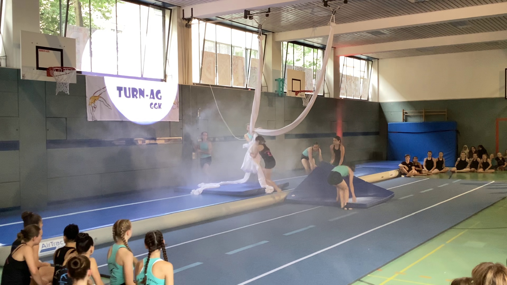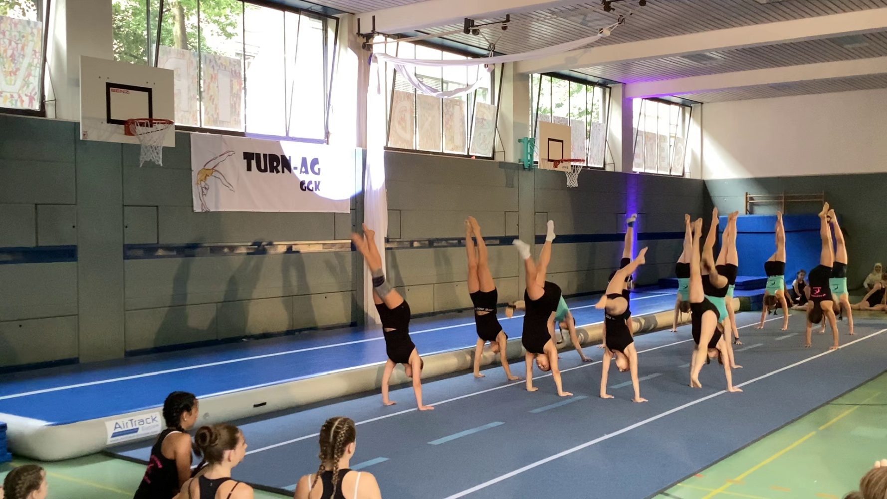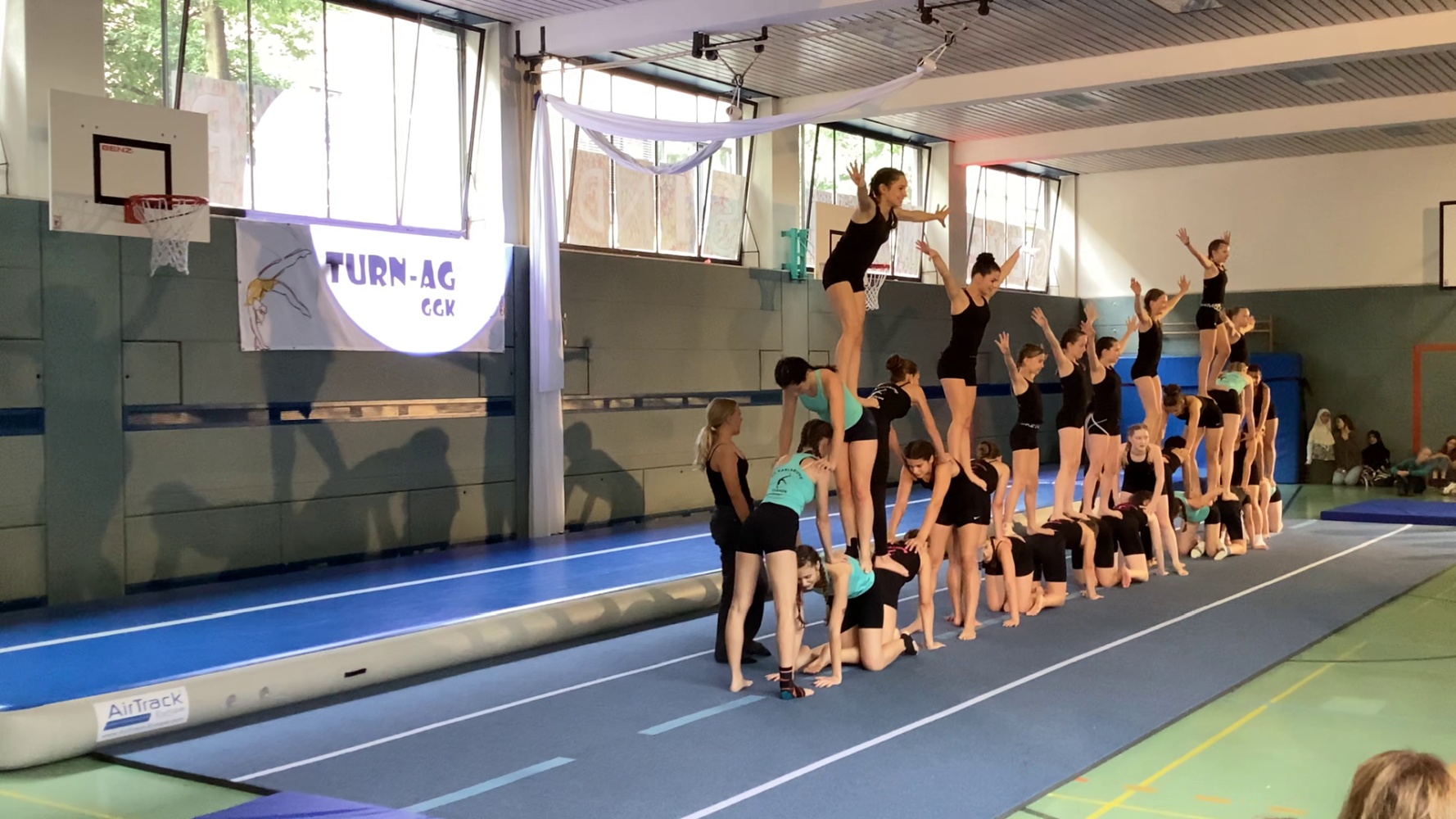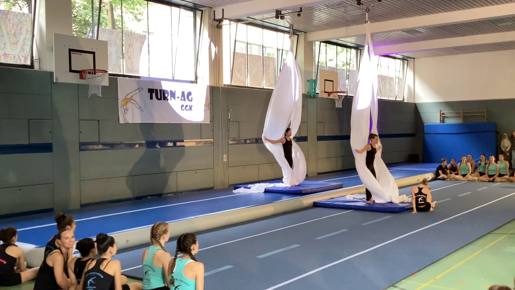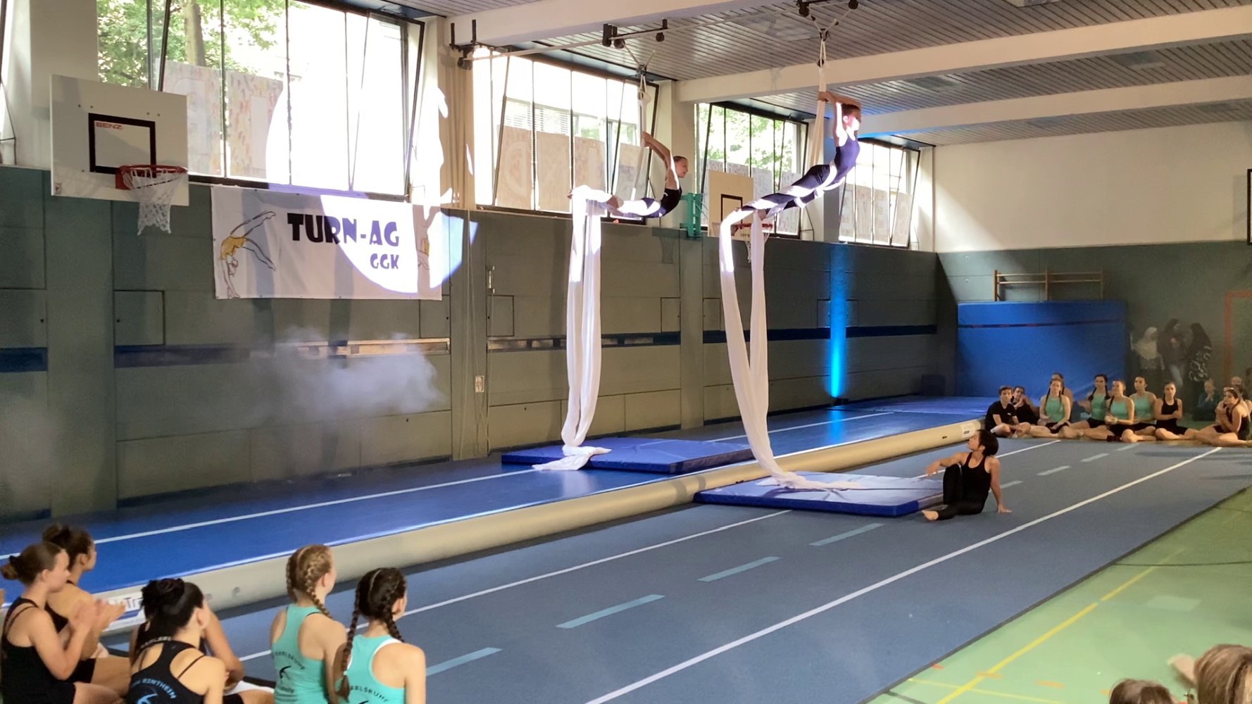 Mit einer unterhaltsamen und sehenswerten Show am Schulfest verabschiedete sich die → AG Gerätturnen/Akrobatik in die verdienten Sommerferien. 32 Turner und Turnerinnen aus 15 verschiedenen Klassen nahmen das Publikum zur Musik von ABBA mit auf eine Reise durch die vielseitige Welt des Turnens: Tänzerische, turnerische und anspruchsvolle akrobatische Elemente und Figuren wurden ergänzt durch eine wunderbare Show an den Vertikaltüchern. Möglich geworden war diese aufwändige Choreografie nur durch die engagierte die großartige Unterstützung unserer Schülermentorinnen, die das ganze Schuljahr über unsere Turner und Turnerinnen begleitet haben.