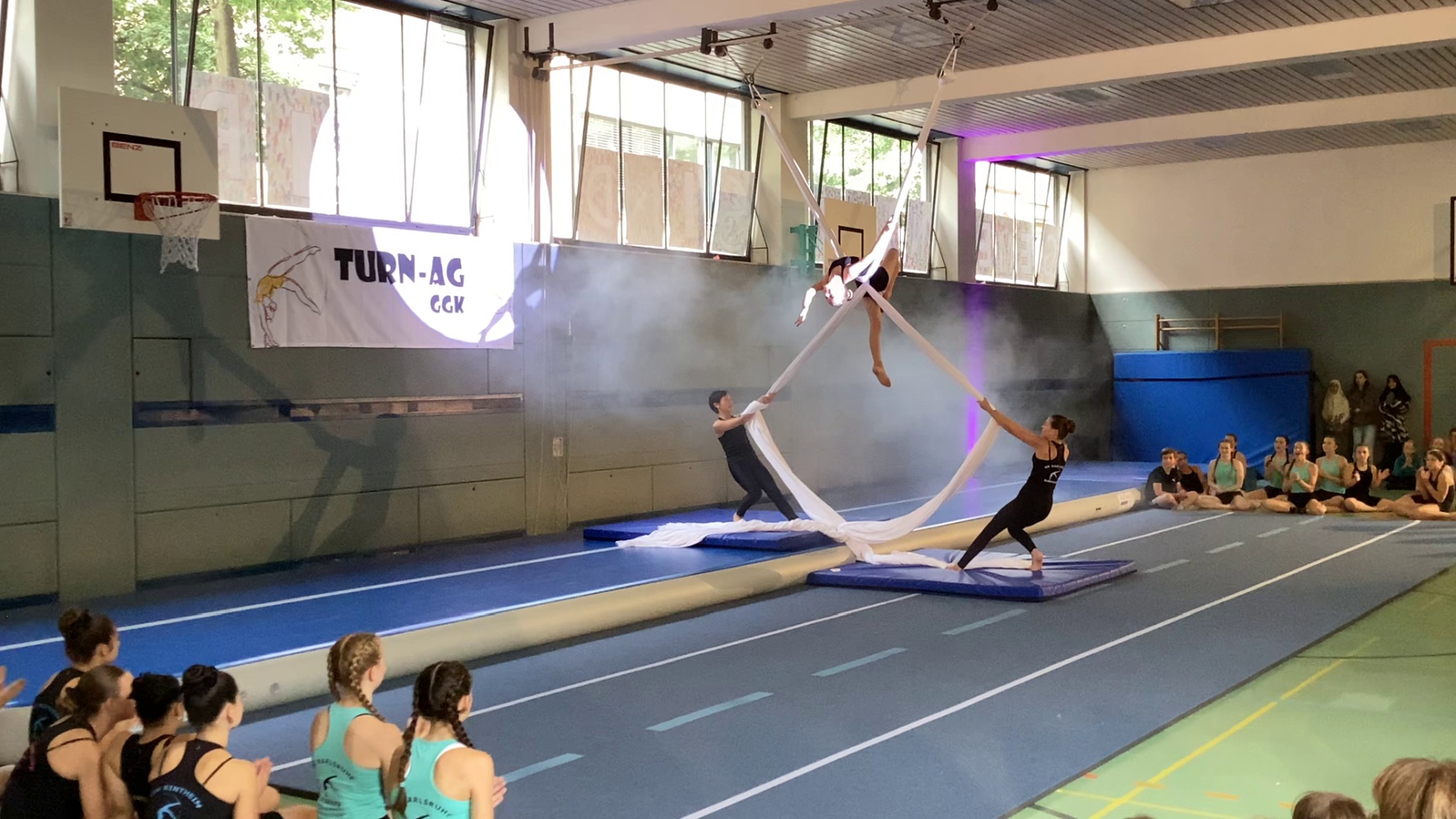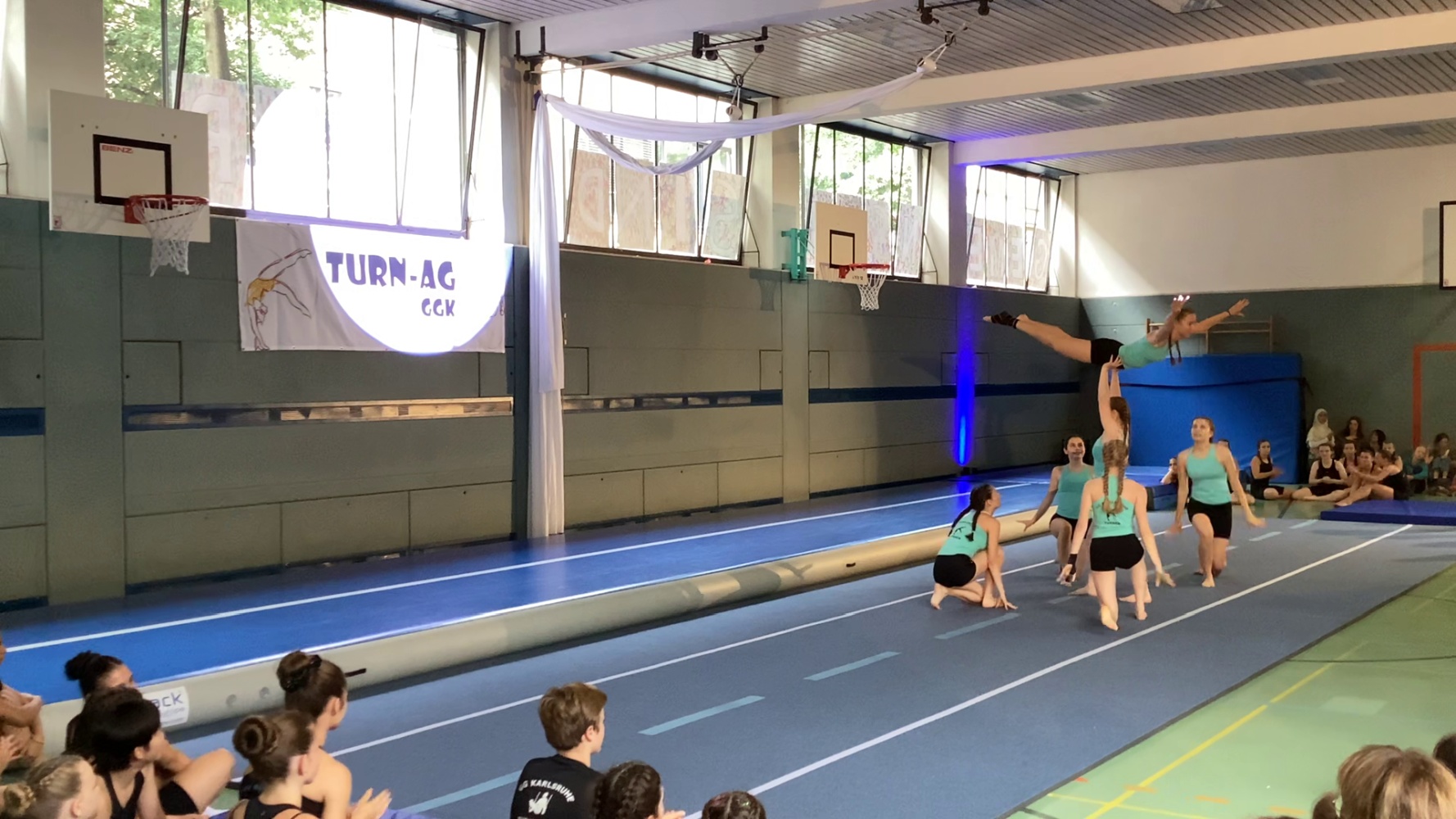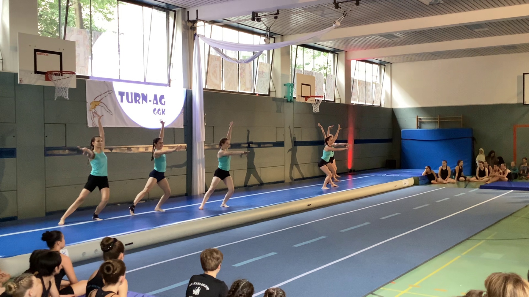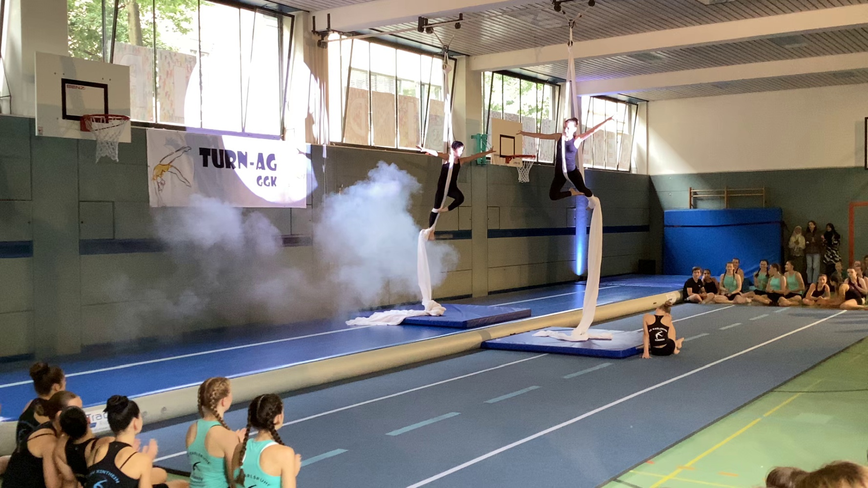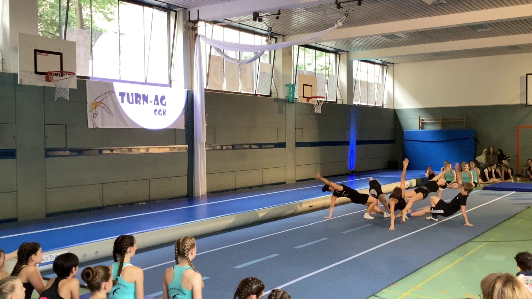 Mit einer unterhaltsamen und sehenswerten Show am Schulfest verabschiedete sich die → AG Gerätturnen/Akrobatik in die verdienten Sommerferien. 32 Turner und Turnerinnen aus 15 verschiedenen Klassen nahmen das Publikum zur Musik von ABBA mit auf eine Reise durch die vielseitige Welt des Turnens: Tänzerische, turnerische und anspruchsvolle akrobatische Elemente und Figuren wurden ergänzt durch eine wunderbare Show an den Vertikaltüchern. Möglich geworden war diese aufwändige Choreografie nur durch die engagierte die großartige Unterstützung unserer Schülermentorinnen, die das ganze Schuljahr über unsere Turner und Turnerinnen begleitet haben.
