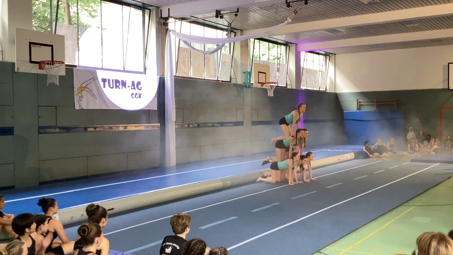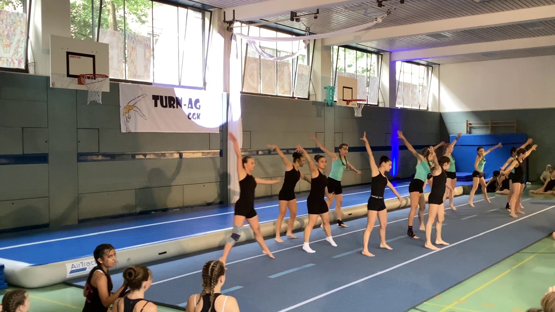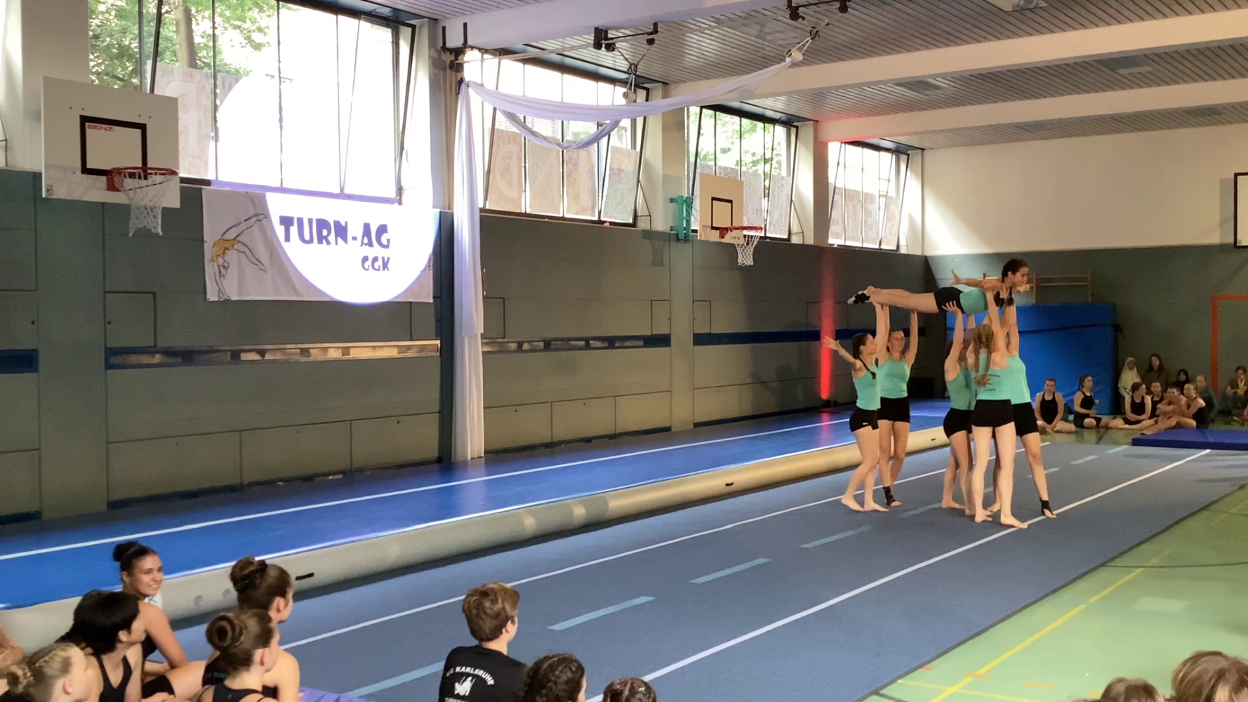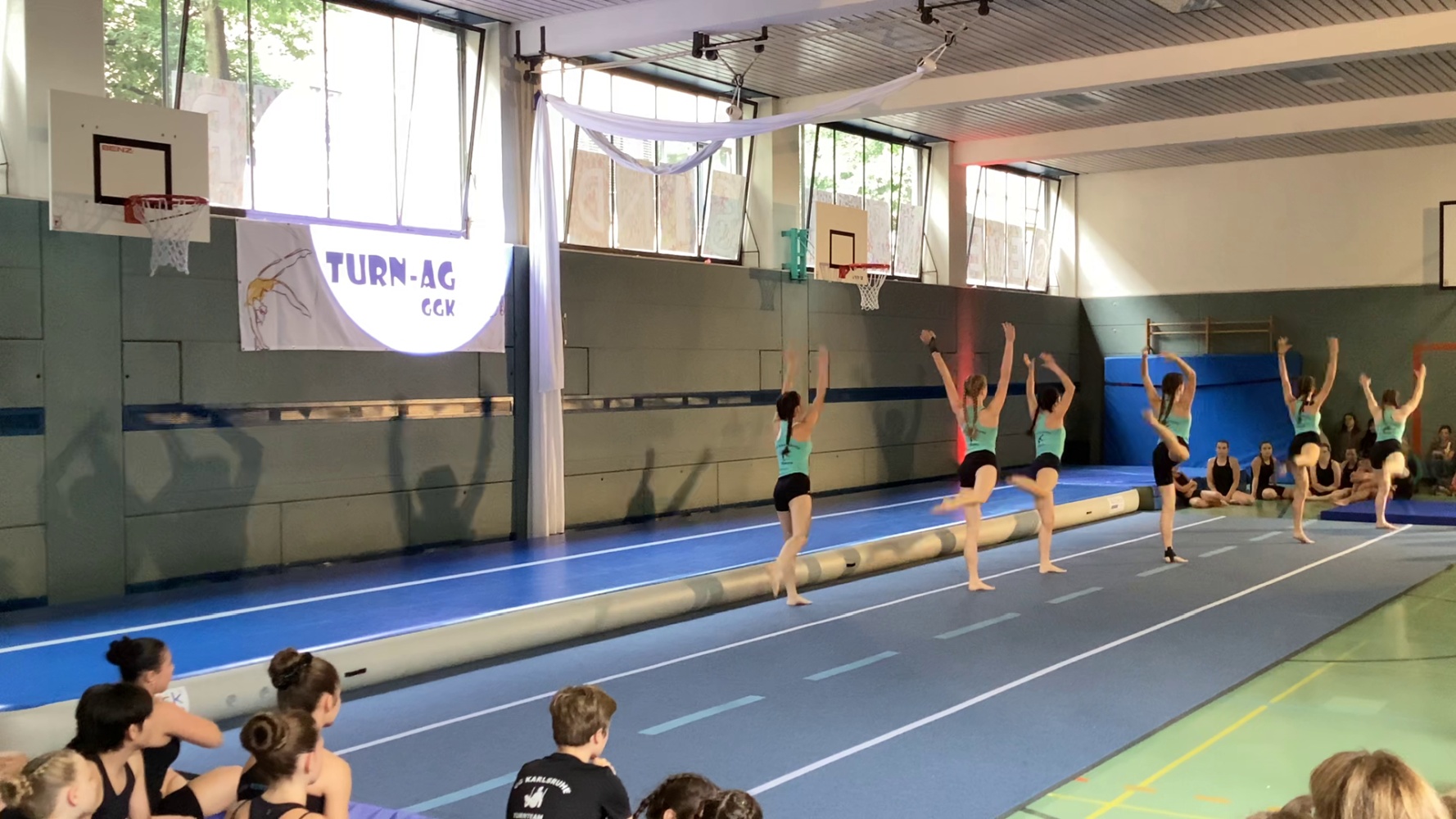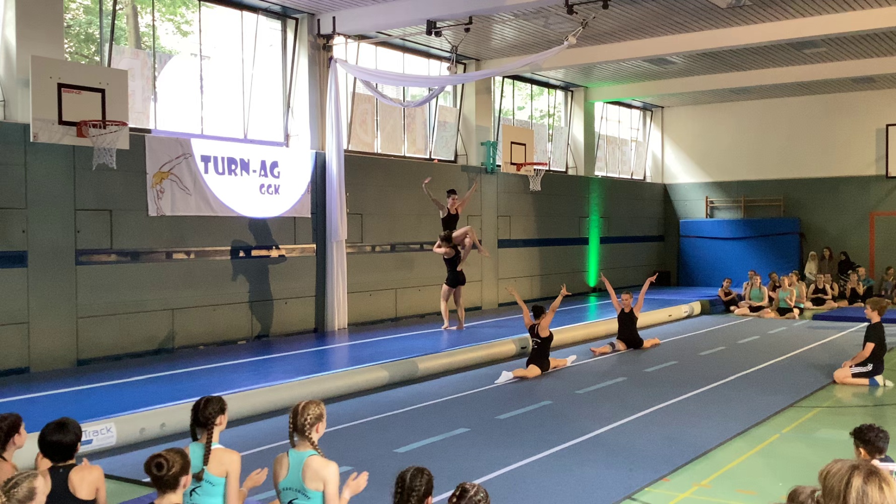 Mit einer unterhaltsamen und sehenswerten Show am Schulfest verabschiedete sich die → AG Gerätturnen/Akrobatik in die verdienten Sommerferien. 32 Turner und Turnerinnen aus 15 verschiedenen Klassen nahmen das Publikum zur Musik von ABBA mit auf eine Reise durch die vielseitige Welt des Turnens: Tänzerische, turnerische und anspruchsvolle akrobatische Elemente und Figuren wurden ergänzt durch eine wunderbare Show an den Vertikaltüchern. Möglich geworden war diese aufwändige Choreografie nur durch die engagierte die großartige Unterstützung unserer Schülermentorinnen, die das ganze Schuljahr über unsere Turner und Turnerinnen begleitet haben.