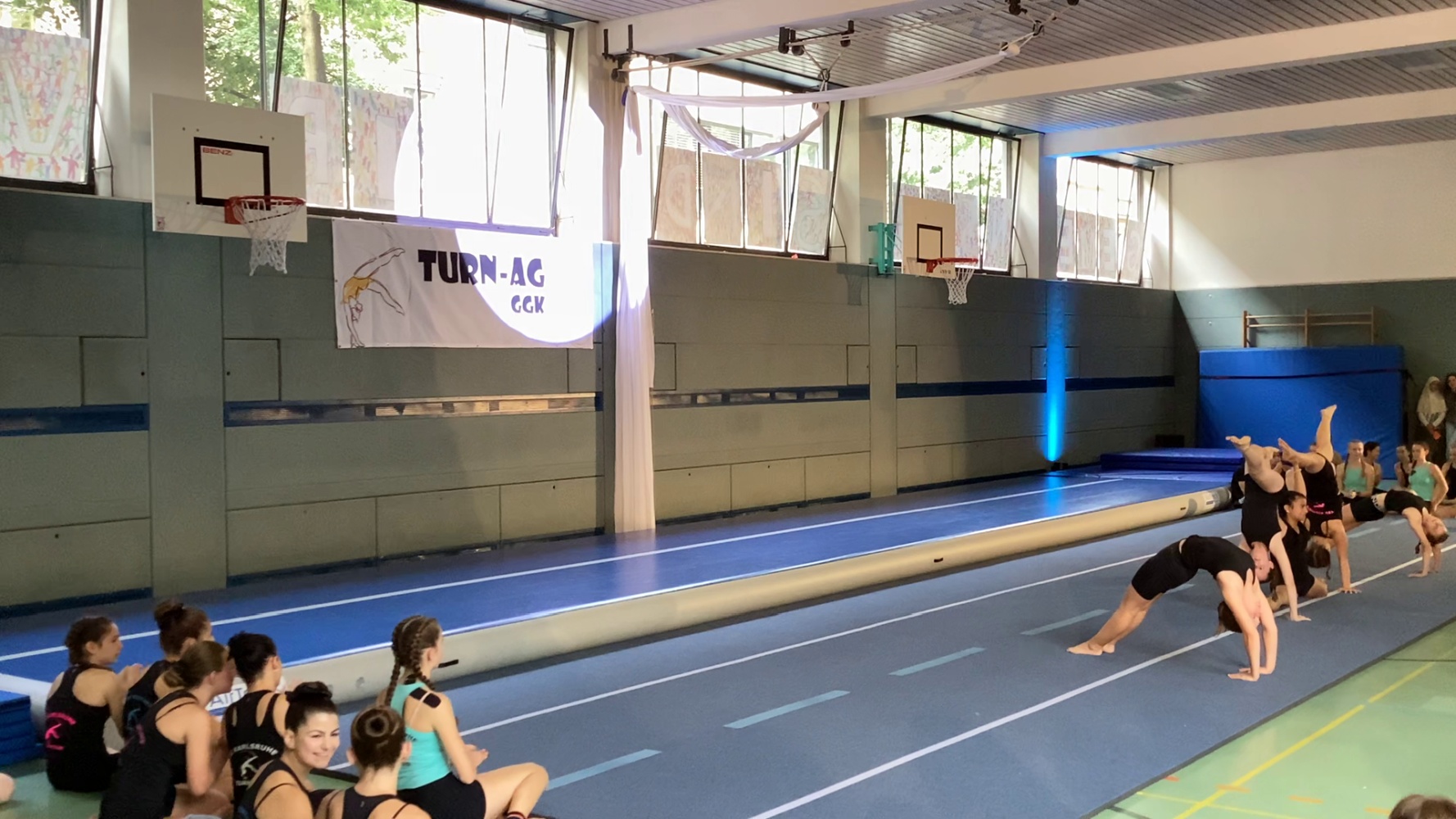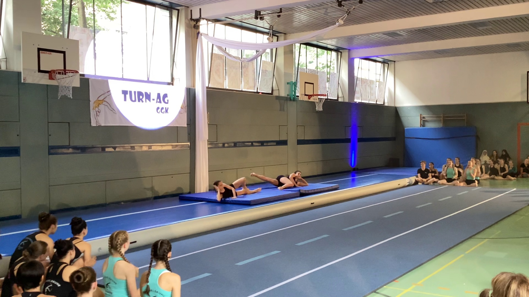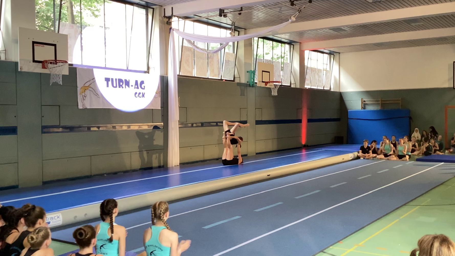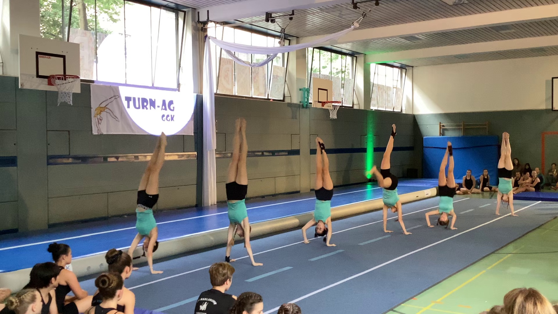 Mit einer unterhaltsamen und sehenswerten Show am Schulfest verabschiedete sich die → AG Gerätturnen/Akrobatik in die verdienten Sommerferien. 32 Turner und Turnerinnen aus 15 verschiedenen Klassen nahmen das Publikum zur Musik von ABBA mit auf eine Reise durch die vielseitige Welt des Turnens: Tänzerische, turnerische und anspruchsvolle akrobatische Elemente und Figuren wurden ergänzt durch eine wunderbare Show an den Vertikaltüchern. Möglich geworden war diese aufwändige Choreografie nur durch die engagierte die großartige Unterstützung unserer Schülermentorinnen, die das ganze Schuljahr über unsere Turner und Turnerinnen begleitet haben.