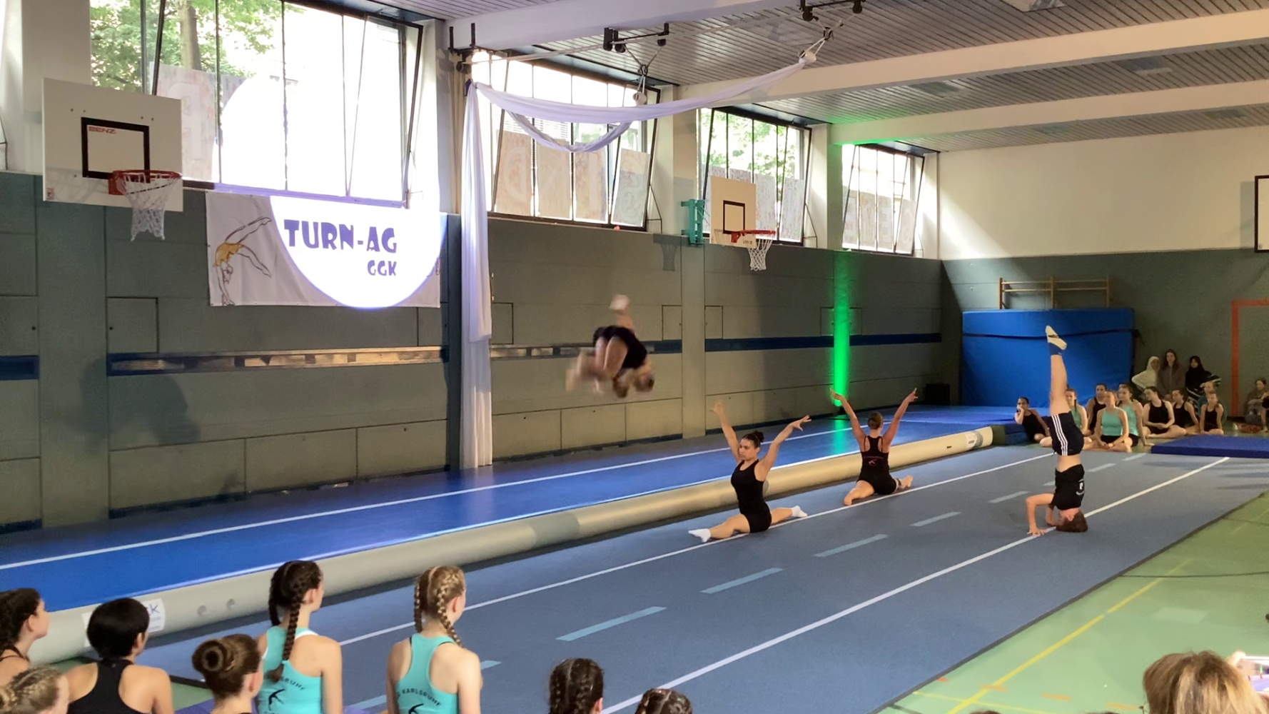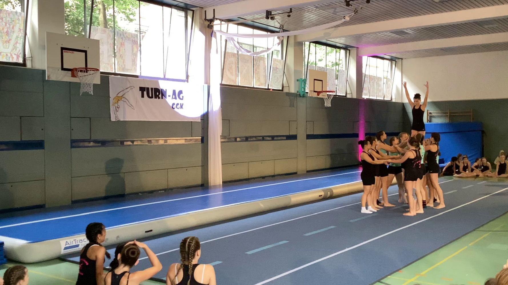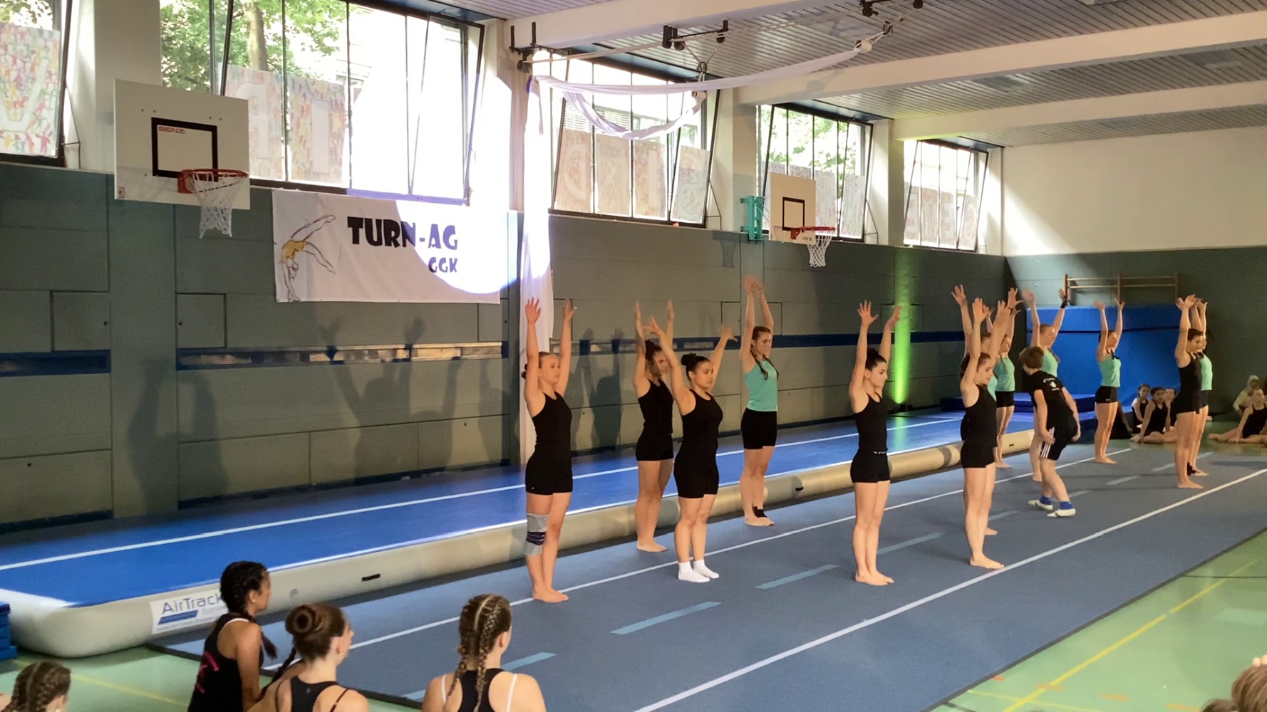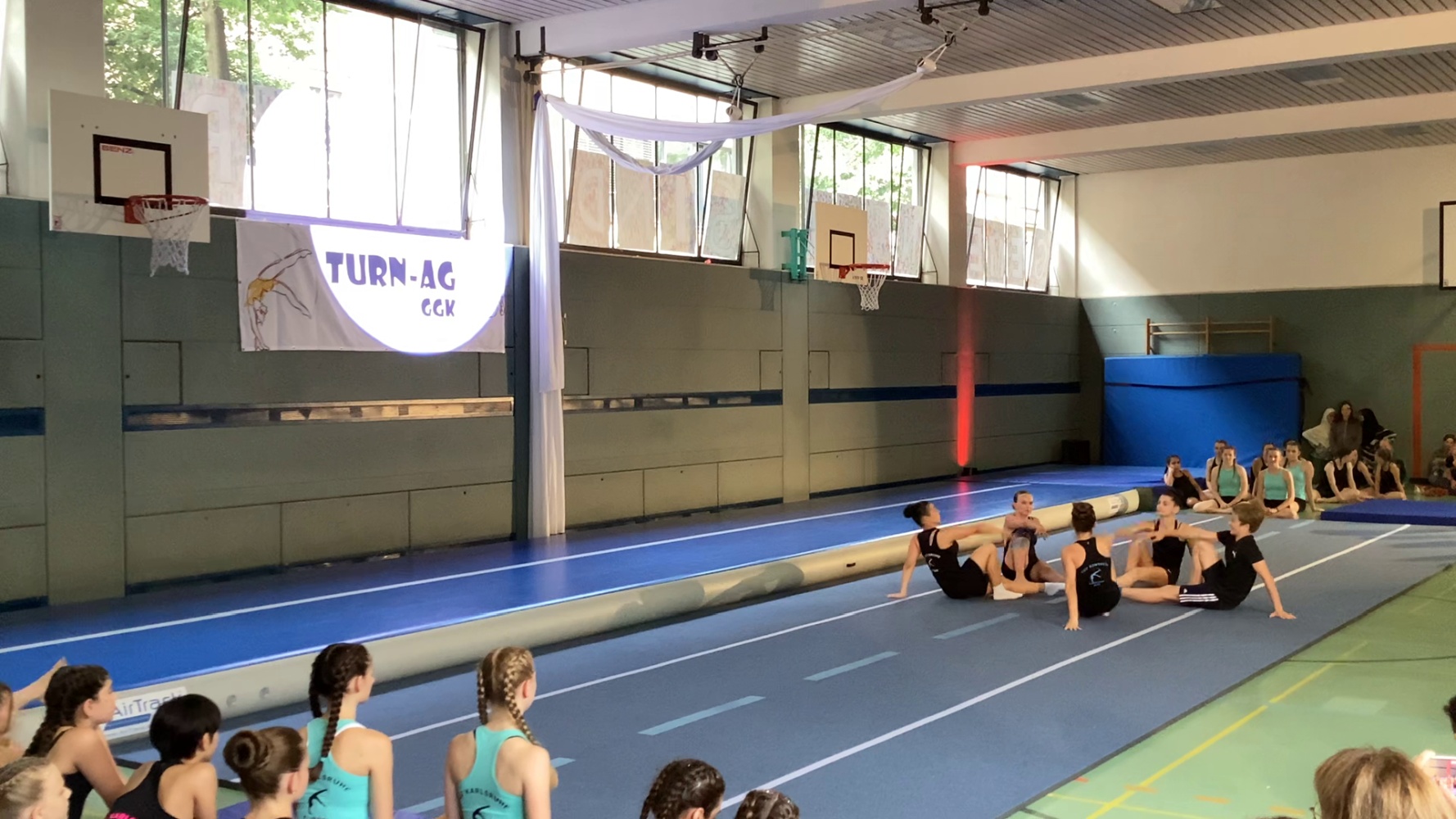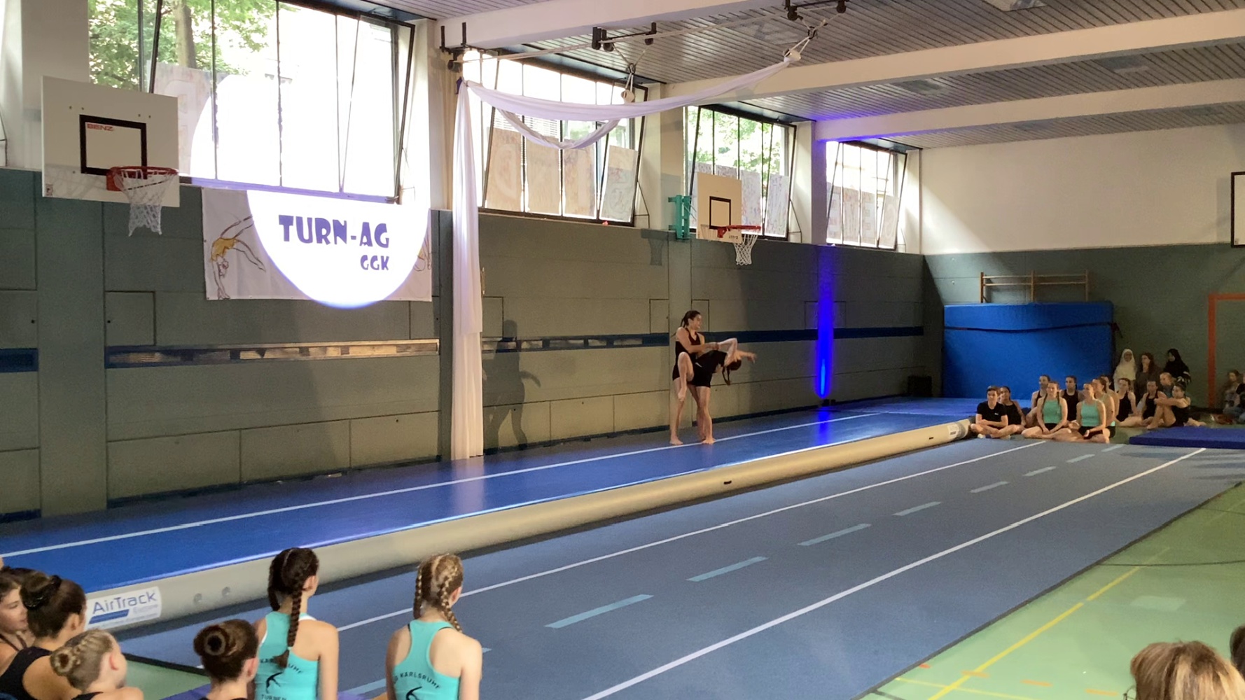 Mit einer unterhaltsamen und sehenswerten Show am Schulfest verabschiedete sich die → AG Gerätturnen/Akrobatik in die verdienten Sommerferien. 32 Turner und Turnerinnen aus 15 verschiedenen Klassen nahmen das Publikum zur Musik von ABBA mit auf eine Reise durch die vielseitige Welt des Turnens: Tänzerische, turnerische und anspruchsvolle akrobatische Elemente und Figuren wurden ergänzt durch eine wunderbare Show an den Vertikaltüchern. Möglich geworden war diese aufwändige Choreografie nur durch die engagierte die großartige Unterstützung unserer Schülermentorinnen, die das ganze Schuljahr über unsere Turner und Turnerinnen begleitet haben.