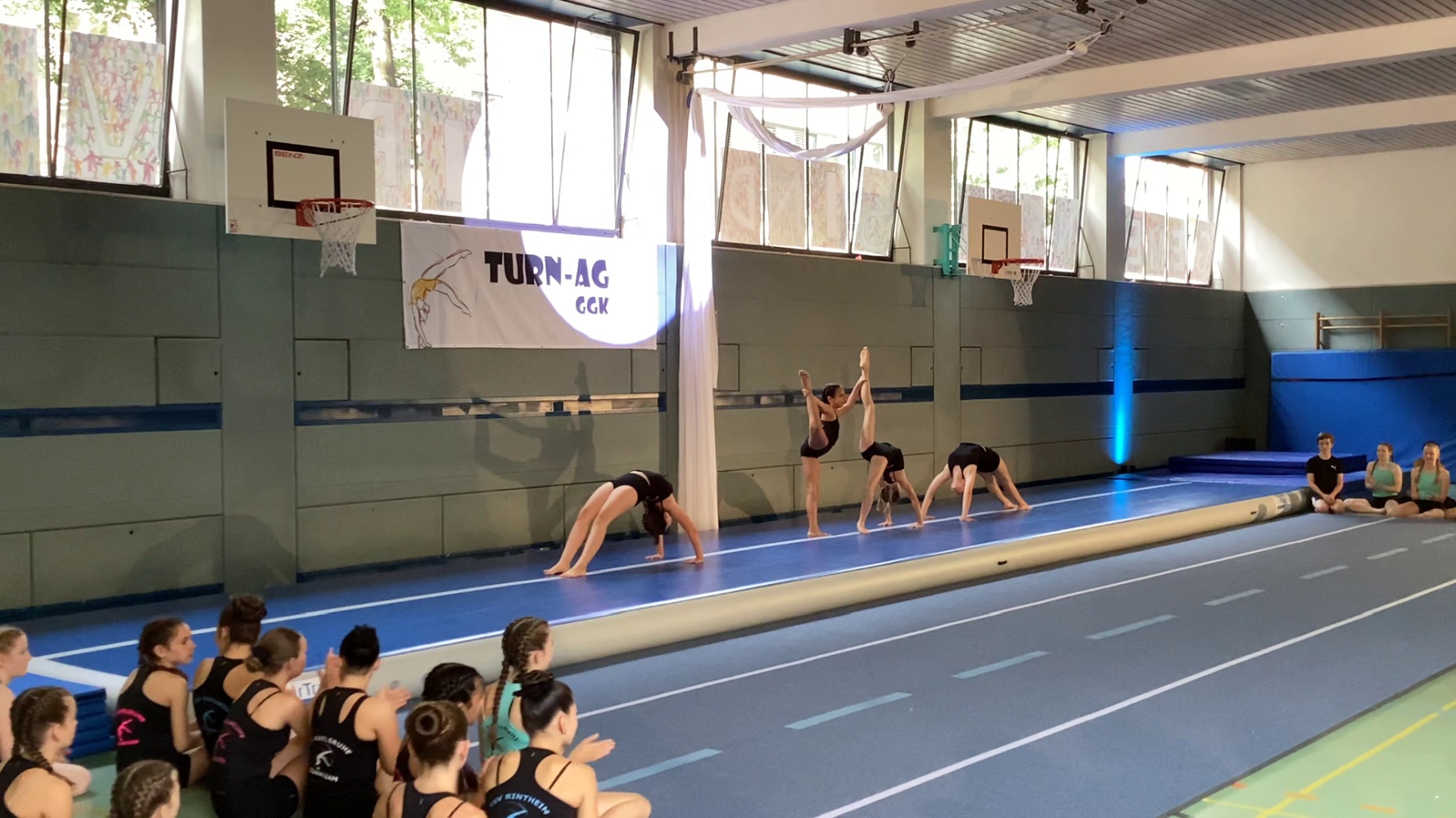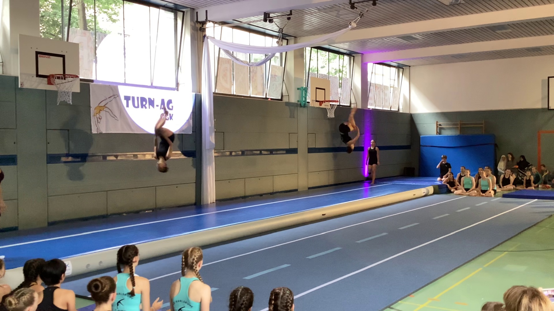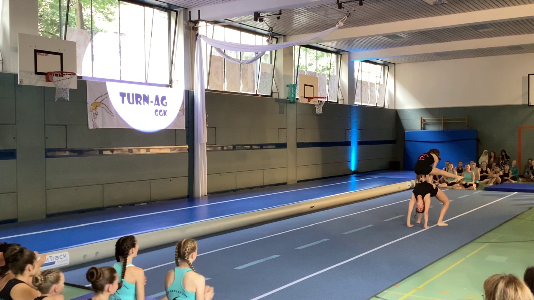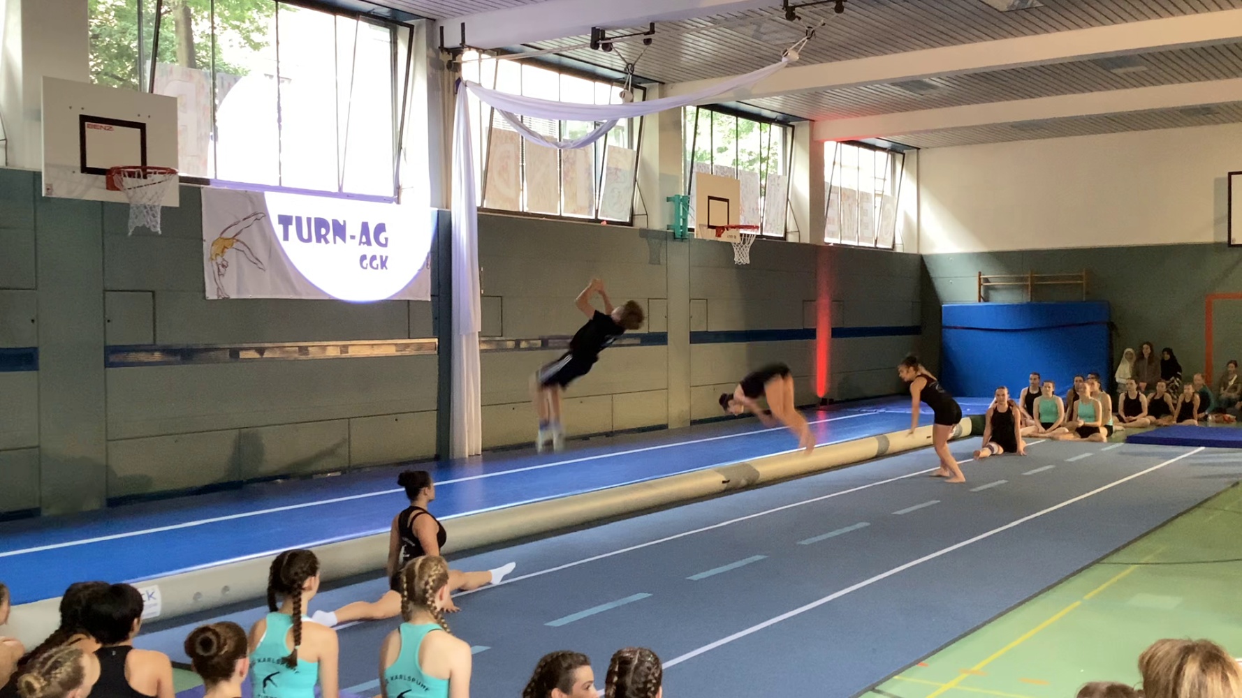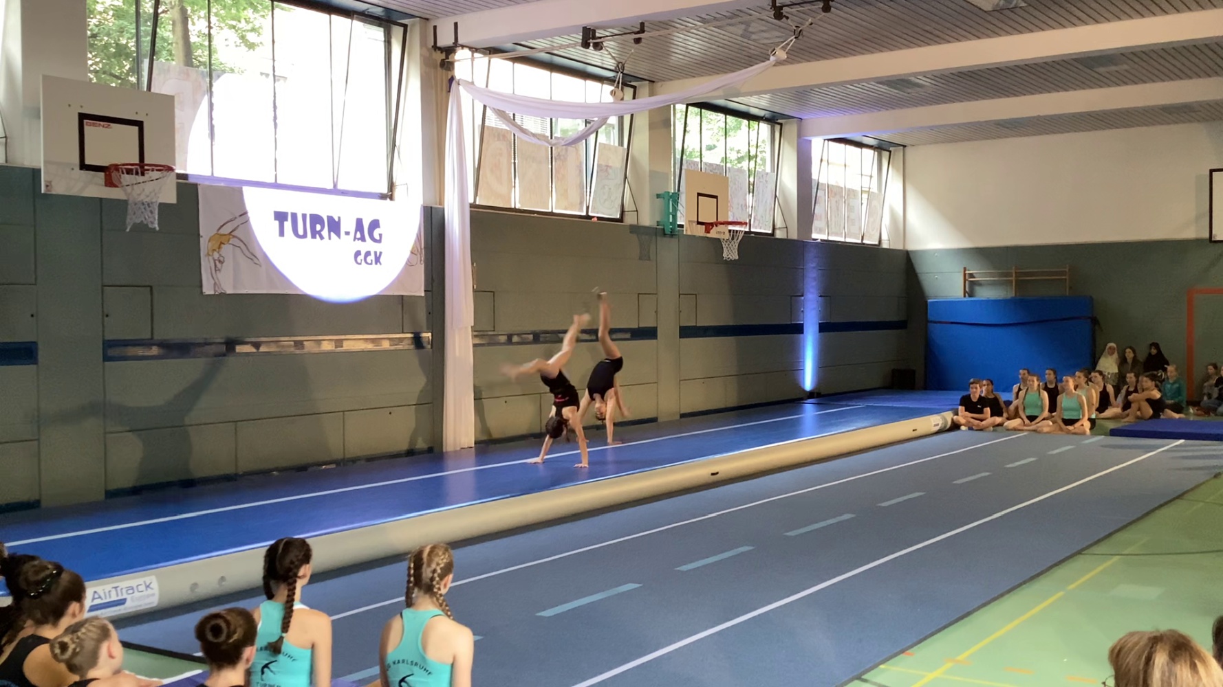 Mit einer unterhaltsamen und sehenswerten Show am Schulfest verabschiedete sich die → AG Gerätturnen/Akrobatik in die verdienten Sommerferien. 32 Turner und Turnerinnen aus 15 verschiedenen Klassen nahmen das Publikum zur Musik von ABBA mit auf eine Reise durch die vielseitige Welt des Turnens: Tänzerische, turnerische und anspruchsvolle akrobatische Elemente und Figuren wurden ergänzt durch eine wunderbare Show an den Vertikaltüchern. Möglich geworden war diese aufwändige Choreografie nur durch die engagierte die großartige Unterstützung unserer Schülermentorinnen, die das ganze Schuljahr über unsere Turner und Turnerinnen begleitet haben.