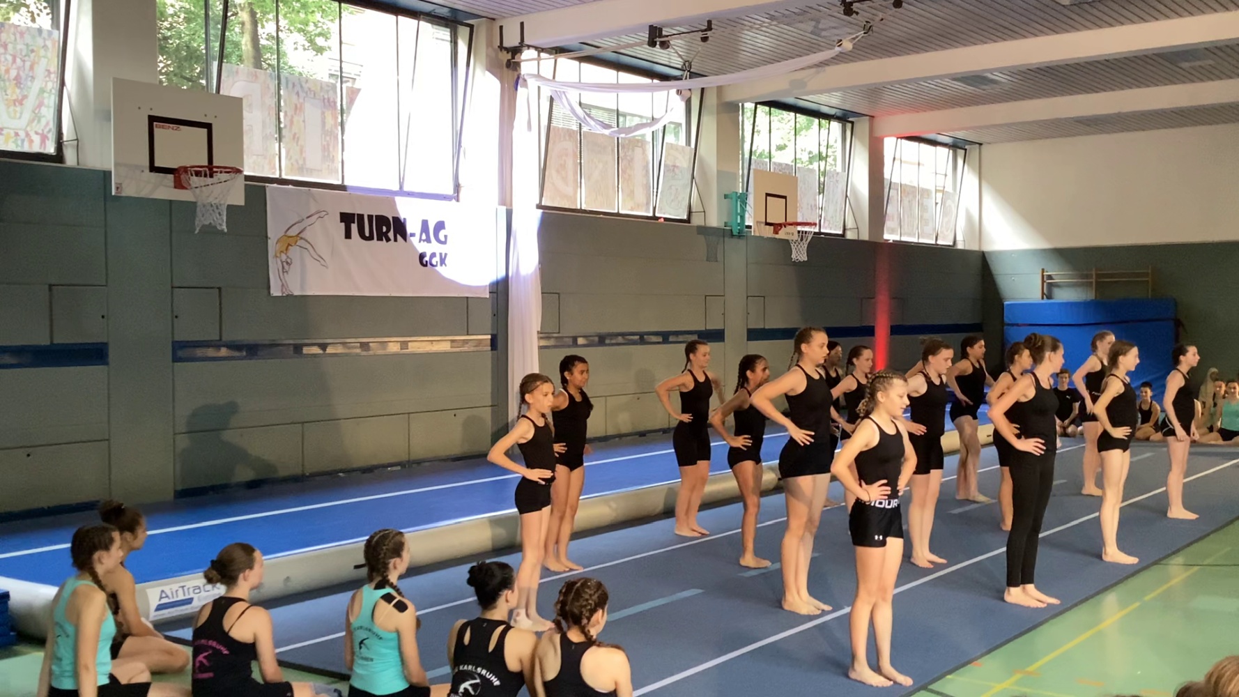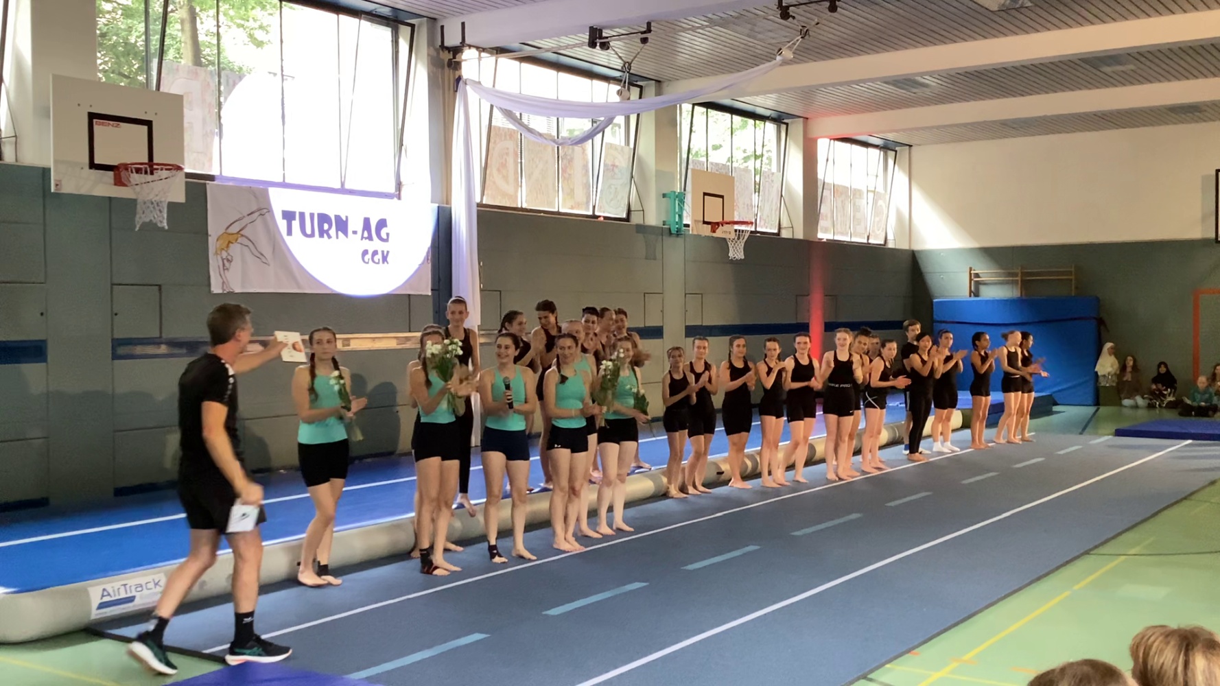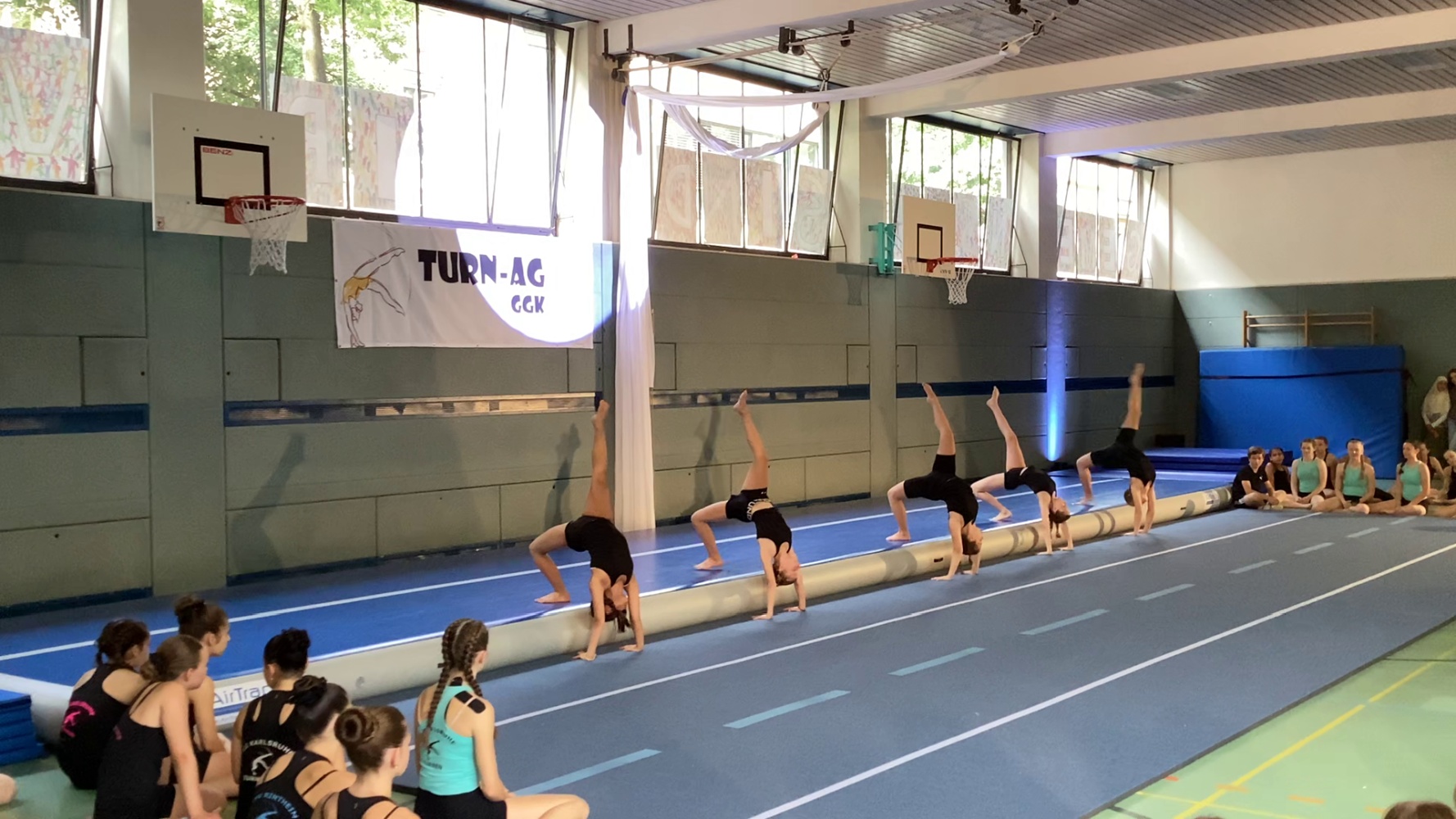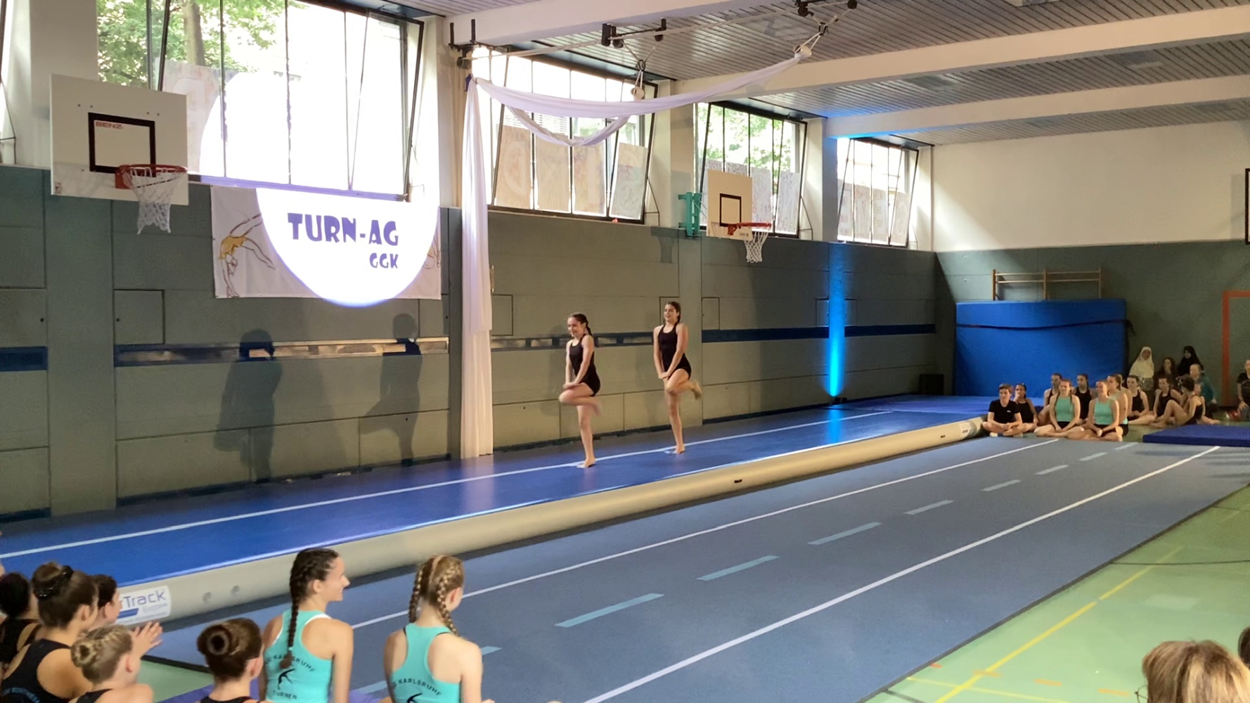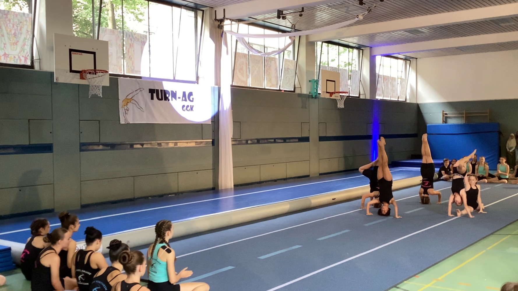 Mit einer unterhaltsamen und sehenswerten Show am Schulfest verabschiedete sich die → AG Gerätturnen/Akrobatik in die verdienten Sommerferien. 32 Turner und Turnerinnen aus 15 verschiedenen Klassen nahmen das Publikum zur Musik von ABBA mit auf eine Reise durch die vielseitige Welt des Turnens: Tänzerische, turnerische und anspruchsvolle akrobatische Elemente und Figuren wurden ergänzt durch eine wunderbare Show an den Vertikaltüchern. Möglich geworden war diese aufwändige Choreografie nur durch die engagierte die großartige Unterstützung unserer Schülermentorinnen, die das ganze Schuljahr über unsere Turner und Turnerinnen begleitet haben.