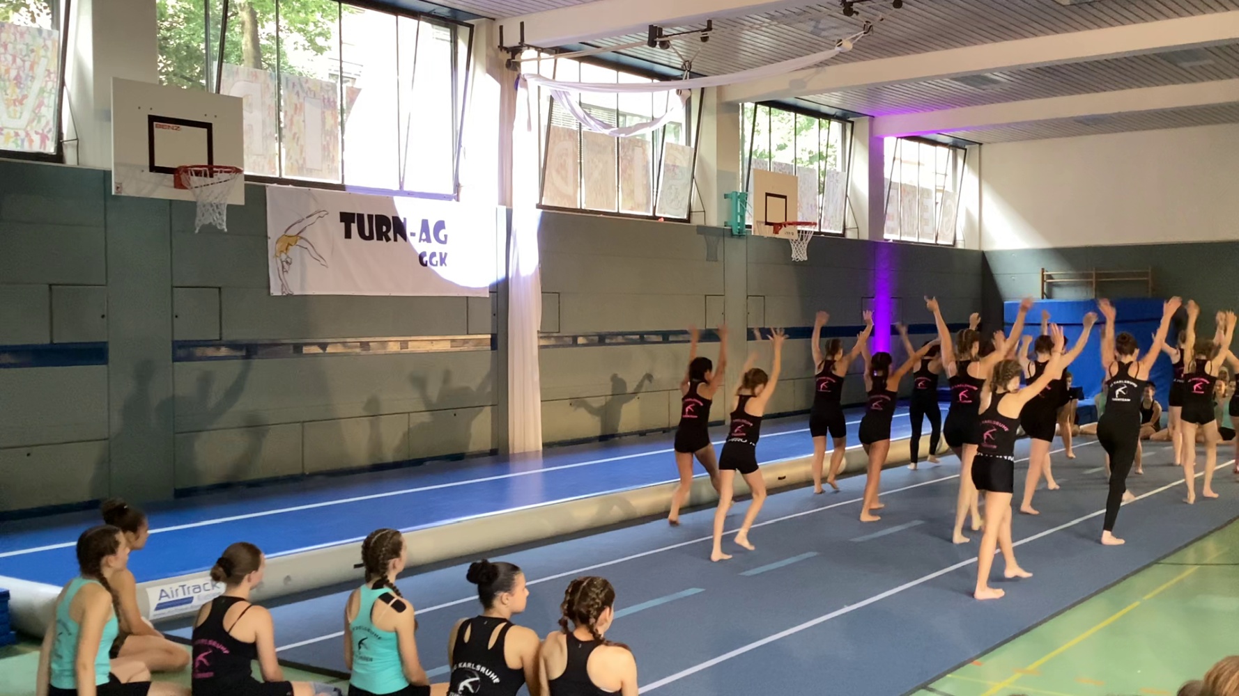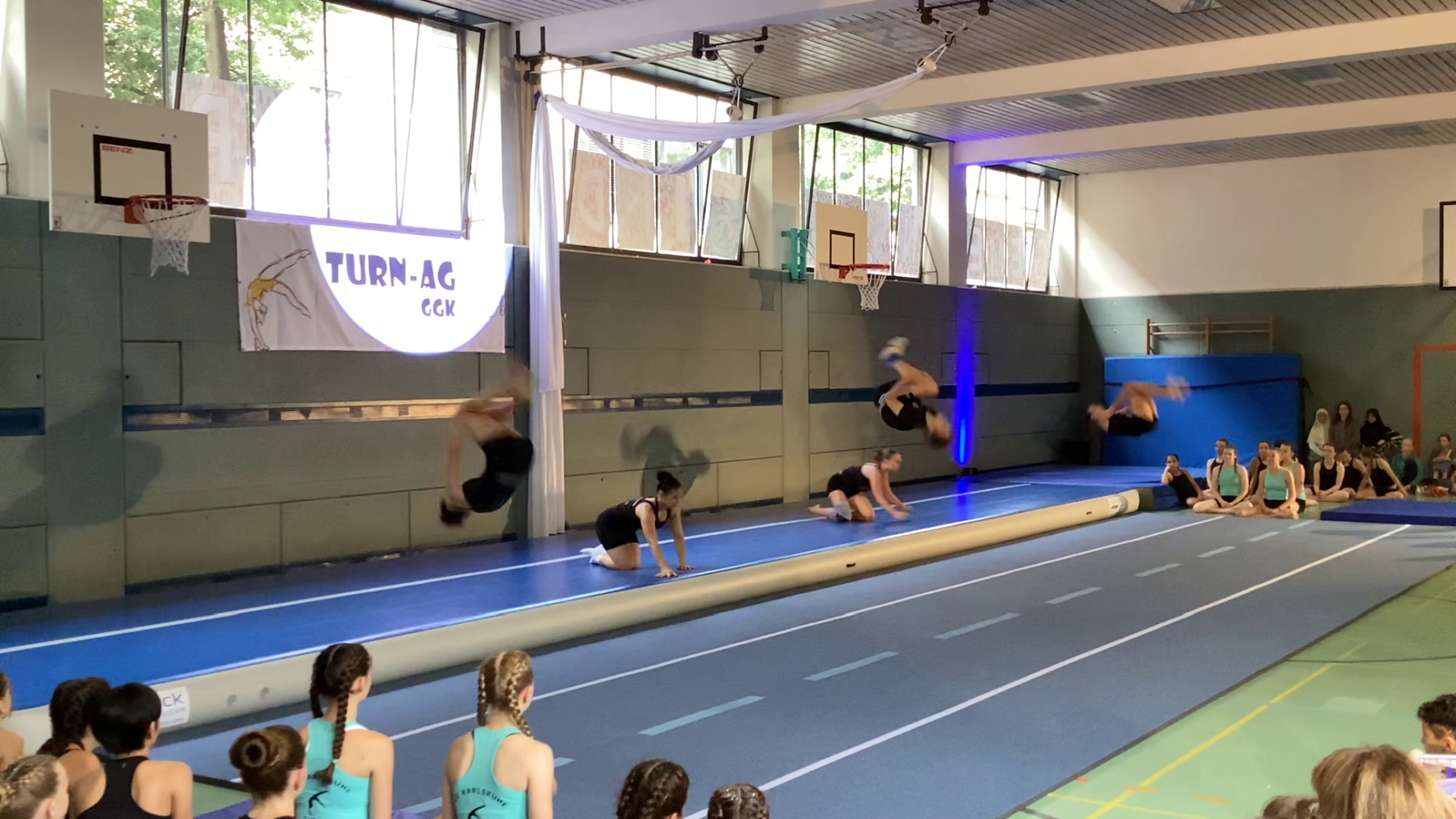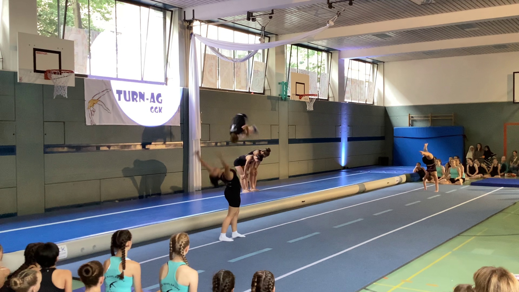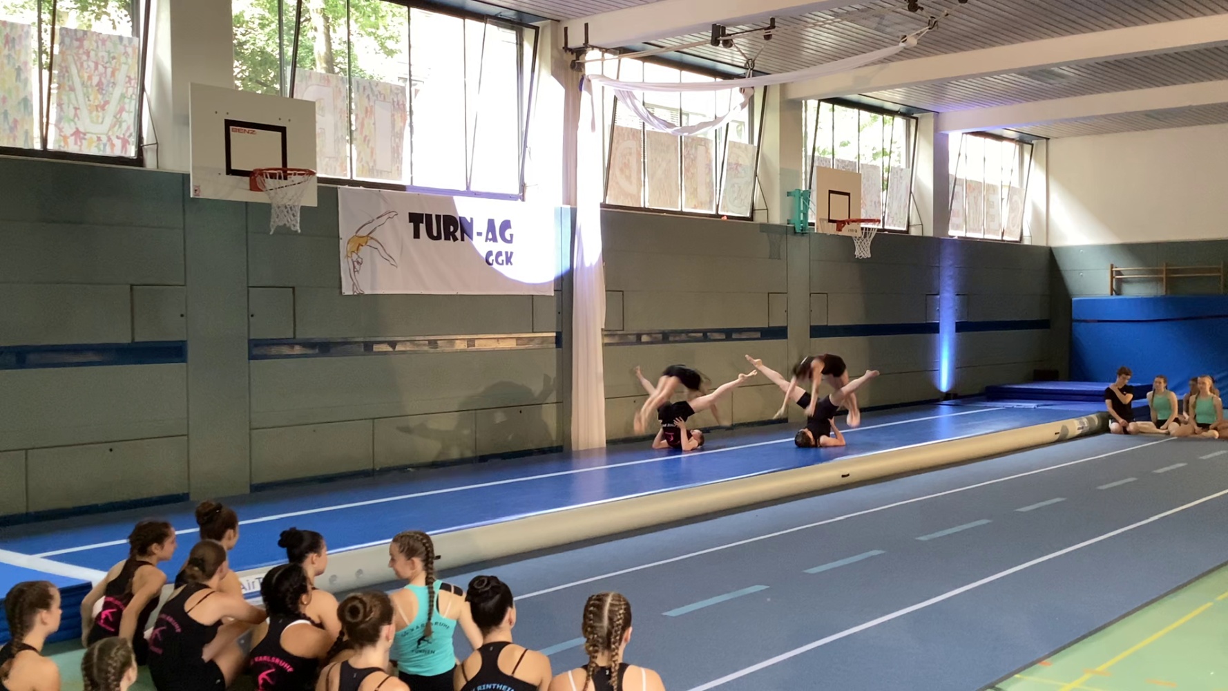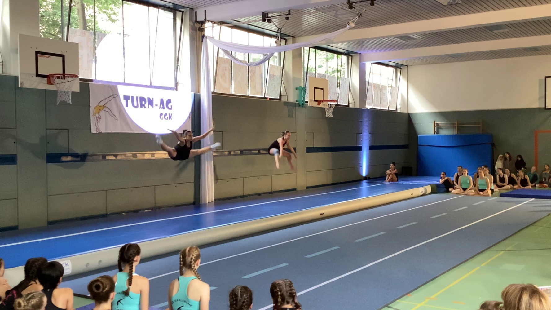 Mit einer unterhaltsamen und sehenswerten Show am Schulfest verabschiedete sich die → AG Gerätturnen/Akrobatik in die verdienten Sommerferien. 32 Turner und Turnerinnen aus 15 verschiedenen Klassen nahmen das Publikum zur Musik von ABBA mit auf eine Reise durch die vielseitige Welt des Turnens: Tänzerische, turnerische und anspruchsvolle akrobatische Elemente und Figuren wurden ergänzt durch eine wunderbare Show an den Vertikaltüchern. Möglich geworden war diese aufwändige Choreografie nur durch die engagierte die großartige Unterstützung unserer Schülermentorinnen, die das ganze Schuljahr über unsere Turner und Turnerinnen begleitet haben.