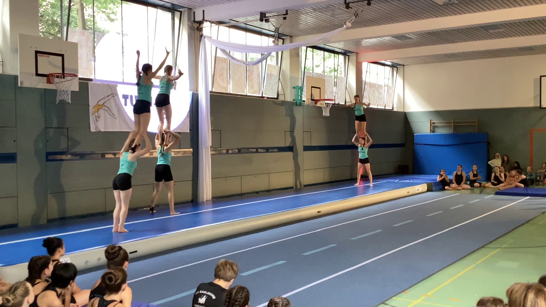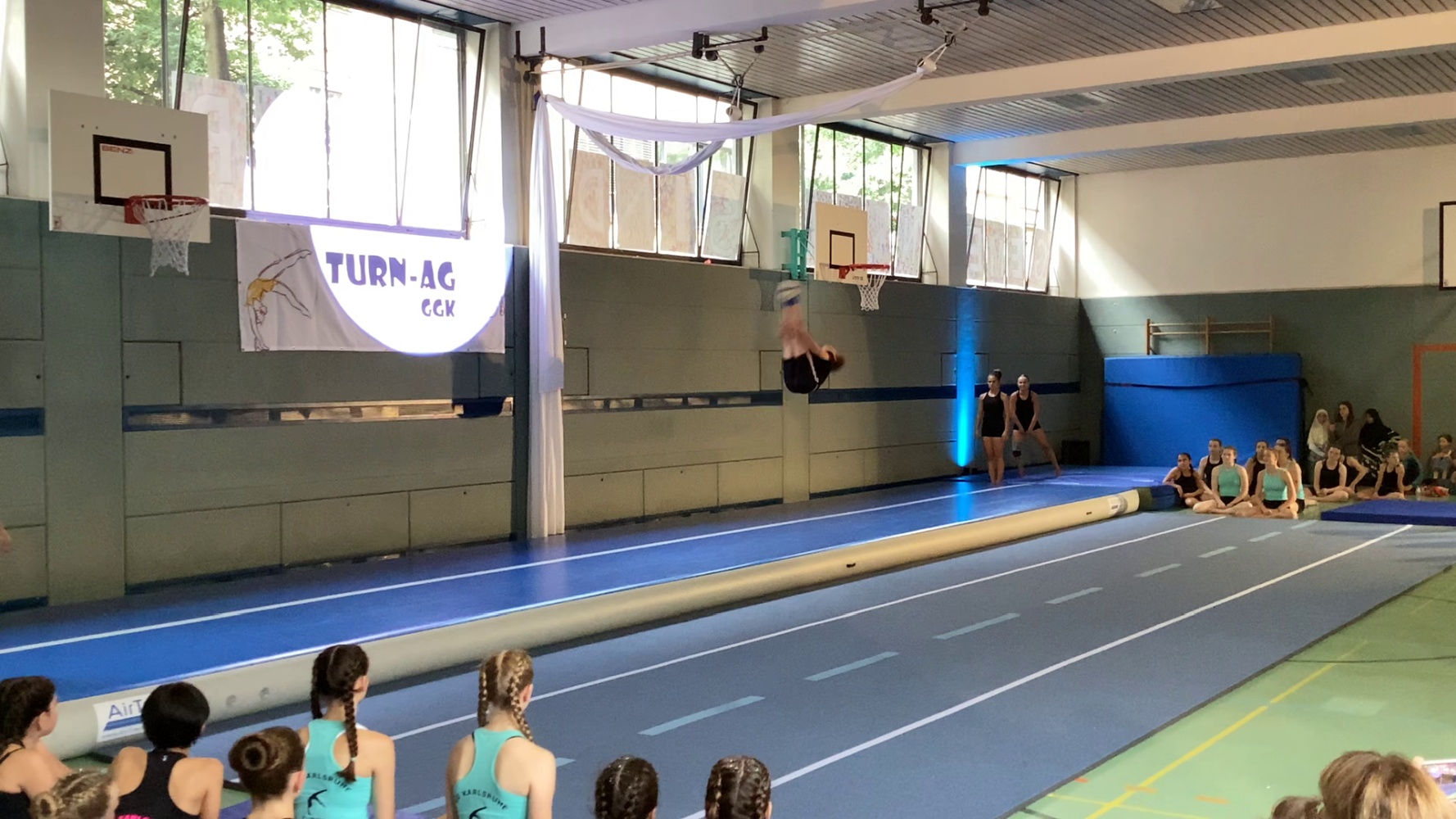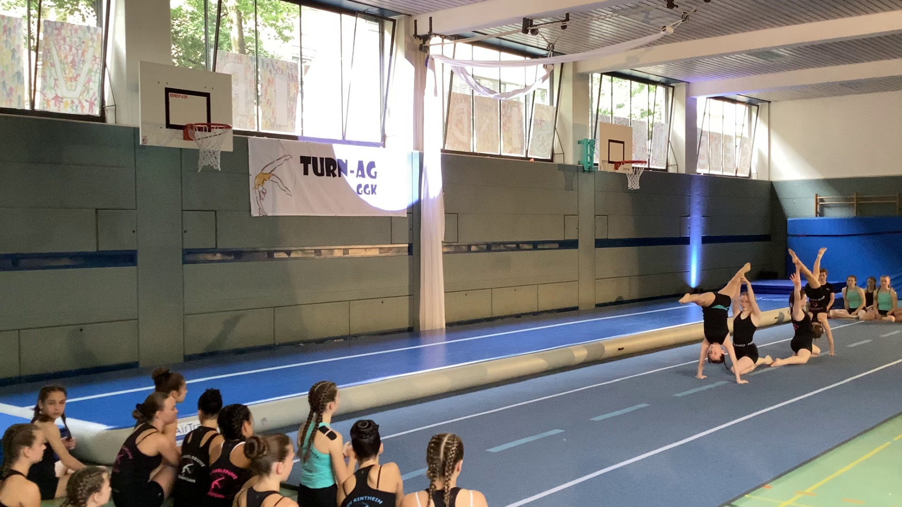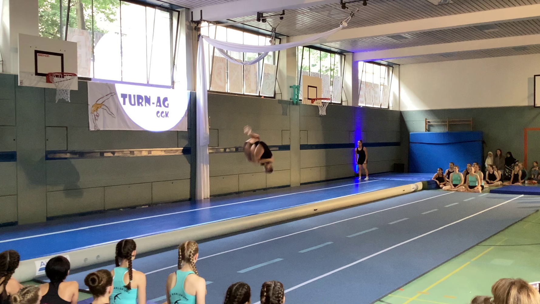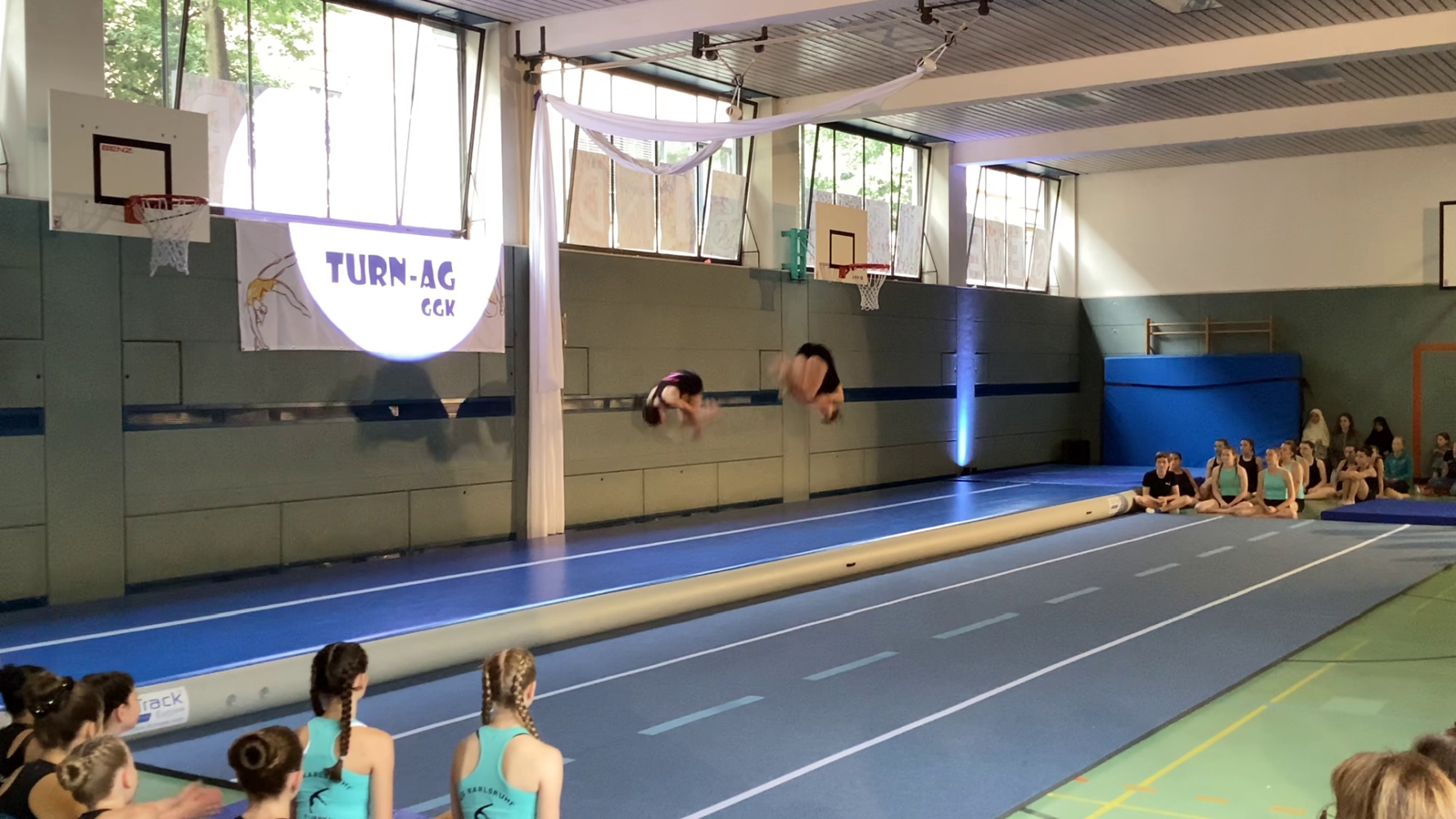 Mit einer unterhaltsamen und sehenswerten Show am Schulfest verabschiedete sich die → AG Gerätturnen/Akrobatik in die verdienten Sommerferien. 32 Turner und Turnerinnen aus 15 verschiedenen Klassen nahmen das Publikum zur Musik von ABBA mit auf eine Reise durch die vielseitige Welt des Turnens: Tänzerische, turnerische und anspruchsvolle akrobatische Elemente und Figuren wurden ergänzt durch eine wunderbare Show an den Vertikaltüchern. Möglich geworden war diese aufwändige Choreografie nur durch die engagierte die großartige Unterstützung unserer Schülermentorinnen, die das ganze Schuljahr über unsere Turner und Turnerinnen begleitet haben.
