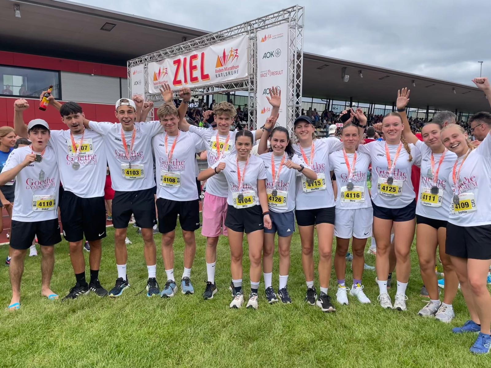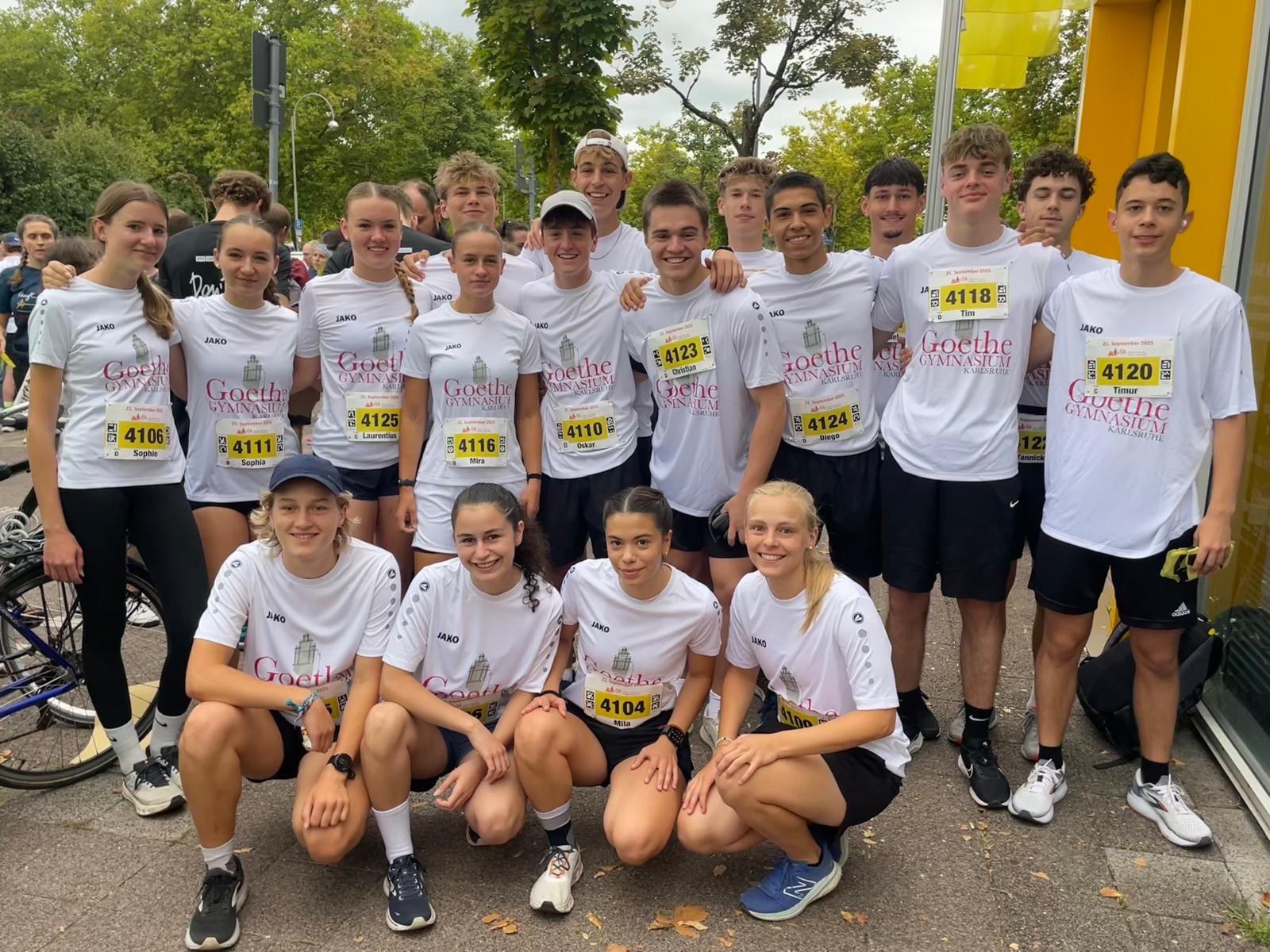 Der Sport-Leistungskurs des Goethe Gymnasiums hat am vergangenen Sonntag am Halbmarathon in Karlsruhe teilgenommen und dabei sowohl sportliche Höchstleistungen als auch Teamgeist bewiesen. Besonders stolz sind alle Teilnehmenden darauf, dass jede Läuferin und jeder Läufer die 21,1km gemeistert hat und ins Ziel kam. Der schnellster Schüler war Oskar, der die Distanz in bemerkenswerten 1 Stunde 40 Minuten bewältigte und die schnellste Schülerin Mira, mit einer Zeit von 1 Stunde 47 Minuten. Das Engagement, die Vorbereitung im Kurs und der Wettkampfgeist spiegeln sich in dieser tollen Leistung wider. Der Kurs bedankt sich vor allem beim Freundeskreis der Schule, der das ganze finanziell unterstützt hat und das Ganze damit erst ermöglicht hat.